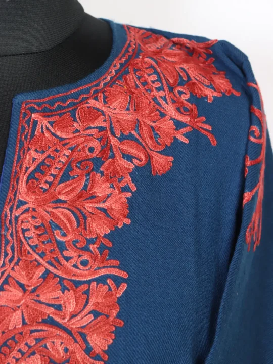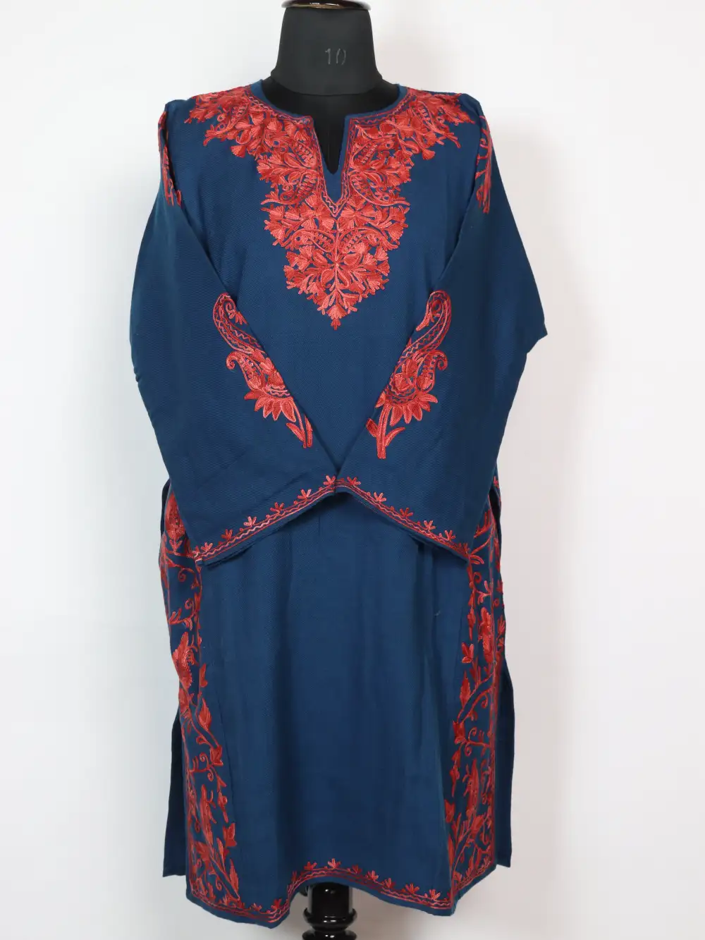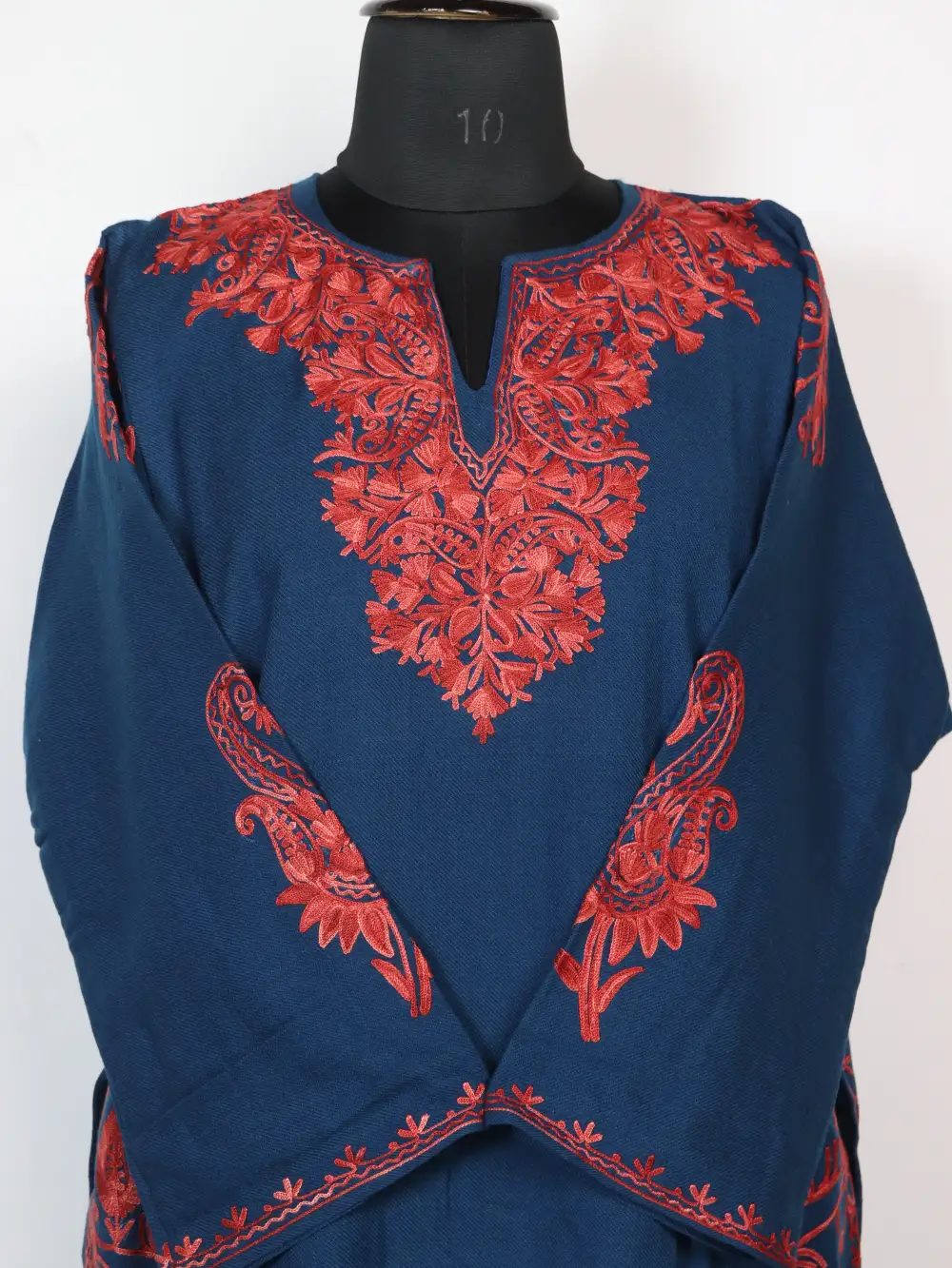 Comfort and modest elegance come together in this cyan green Cashmilon wool feran, where brown-hued Aari badam floral at the neckline and side panel jaal with booti style sleeve work offers a gentle decorative touch. It is sized to a 50 inch chest size and 40 inch in length, and it is fitted with pockets on both sides, the Kashmiri pheran is suitable for daily winter layering.