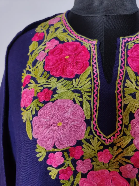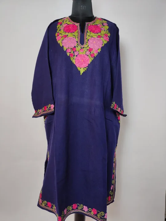 A blend of warmth and artistry, this dark blue pheran is made from soft cashmilon wool. Its neckline is touched with elegant Aari embroidery, where pink with green floral motifs bring subtle vibrance to the fabric. It is easy to style and pleasant to wear, it is perfect for women who prefer comfort with a refined appearance. This pheran makes everyday winter wear both functional and stylish.
