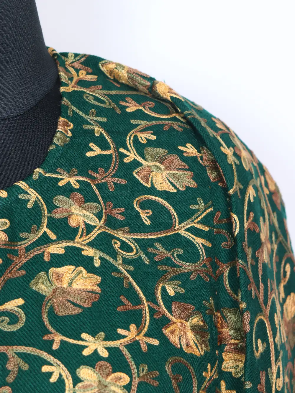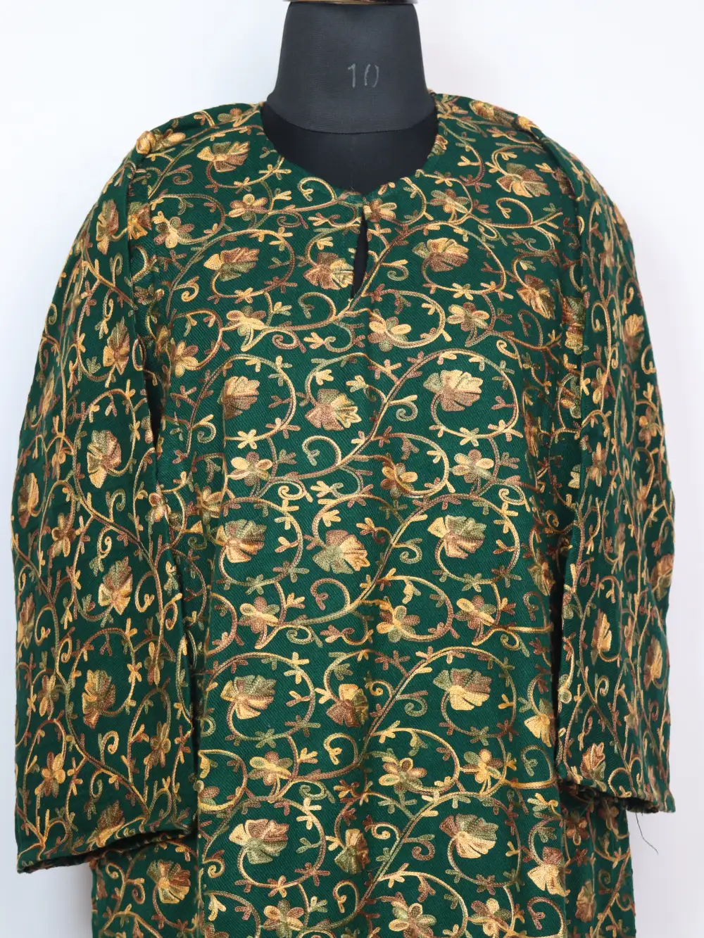 This is a dark green pheran crafted in Cashmilon Wool which carries Aari work in floral motifs at front back all-over. It includes pockets both side for practical use.