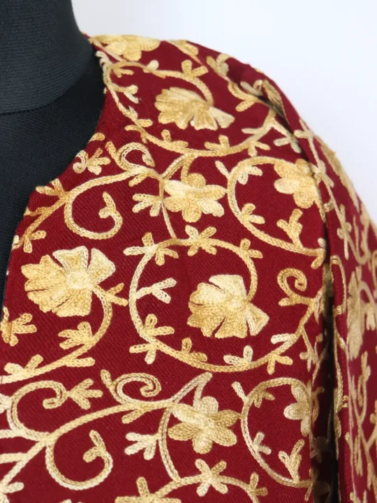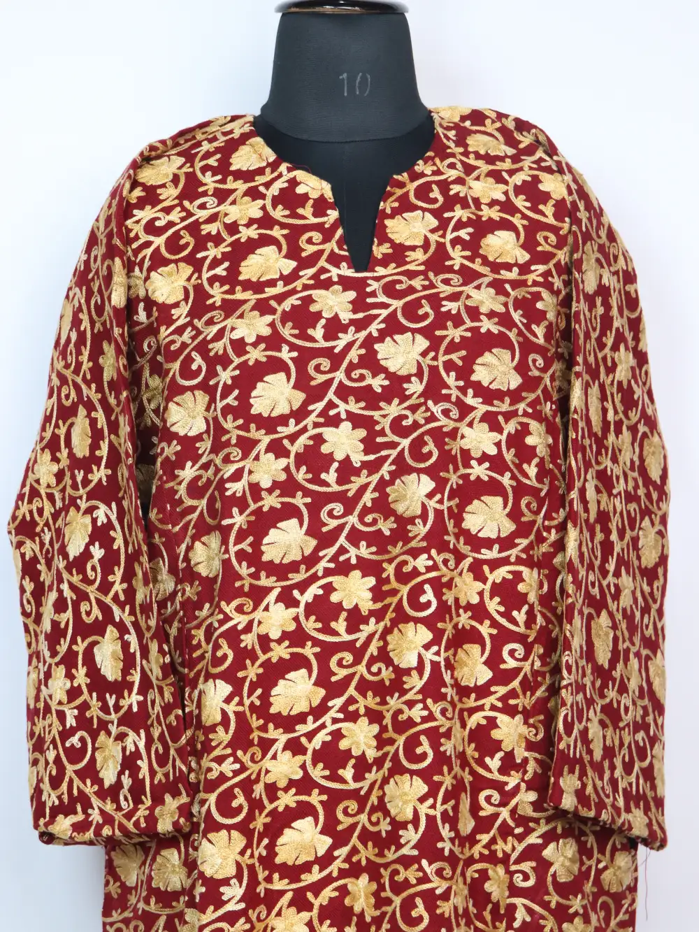Cashmilon Wool stylish Kashmiri pheran in maroon colour features Aari work at front back in all-over style with floral motifs. It has chest size 50 inches and length 43 inches which create a flowing fit.