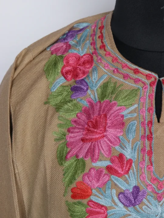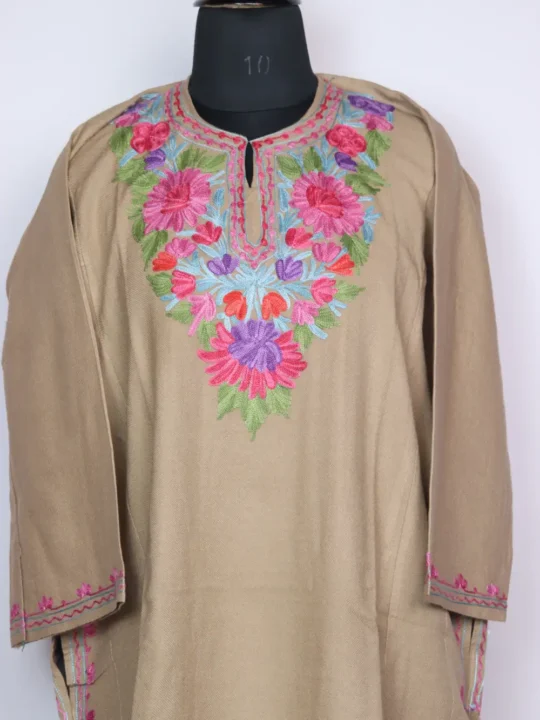 This cashmilon pheran has beautiful floral aari kadhai on the neckline for a clean, subtle look.