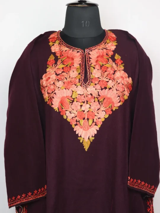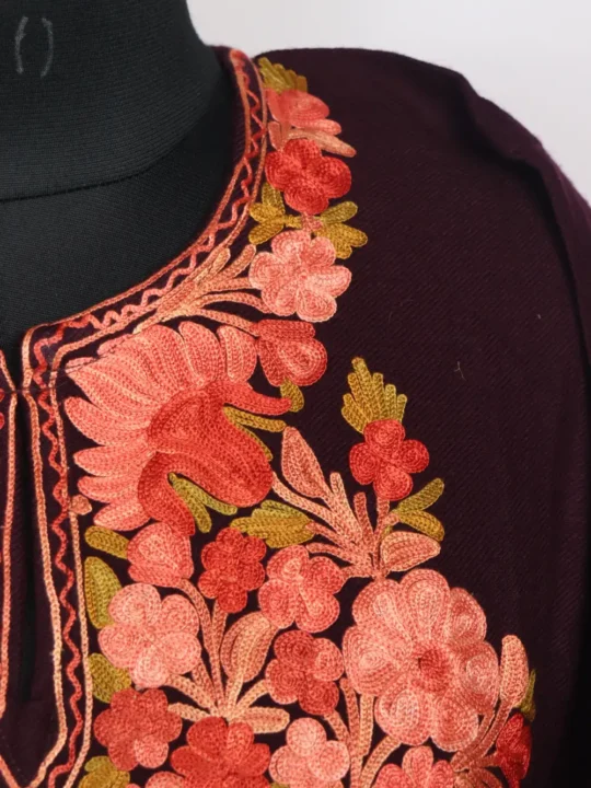 Wine colour phiran online crafted from cashmilon wool features floral Aari embroidery tracing the neckline. This phiran offers everyday comfort with neat detailing and a gentle Kashmiri sensibility in wear.