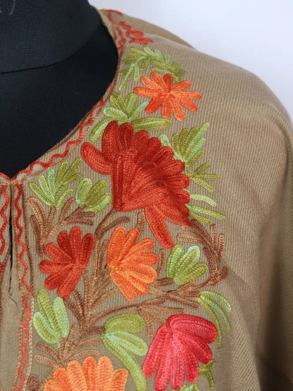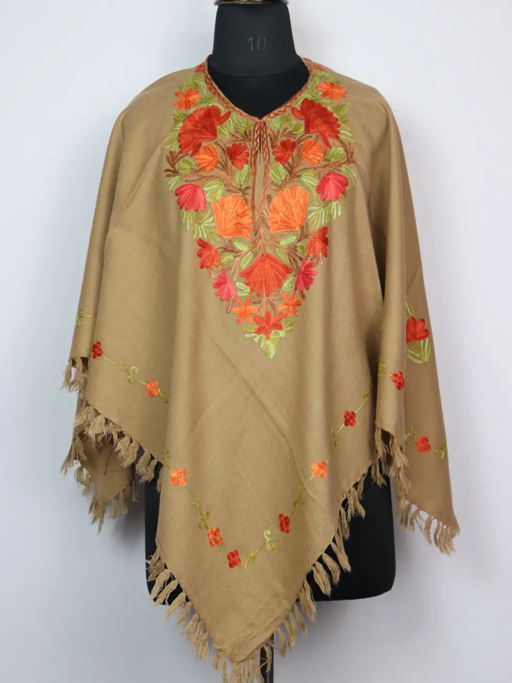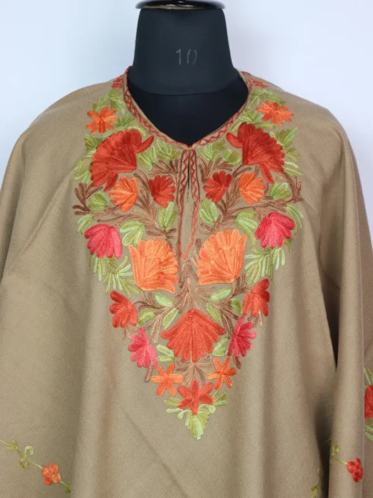 Crafted in Cashmilon wool, this poncho has nice Aari floral work at the neckline. The pattern continues along the bottom for a perfect look. Its width 68 inches with a 34 inch length.