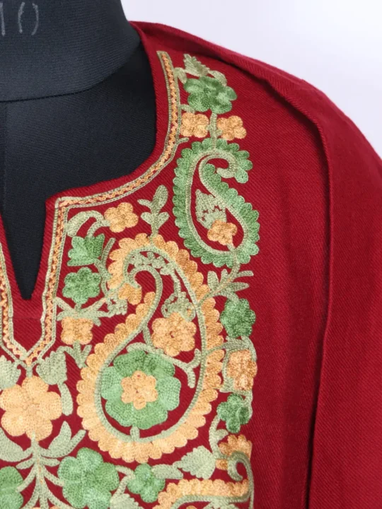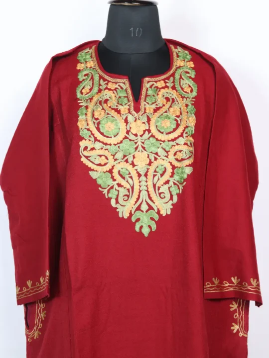 Soft Cashmilon Wool and Aari badam motifs at the neckline define this maroon Kashmiri pheran that comes in 44 inch length and 56 inches chest size for a relaxed fall. This Pheran places craft where it shows most and keeps the rest minimal.