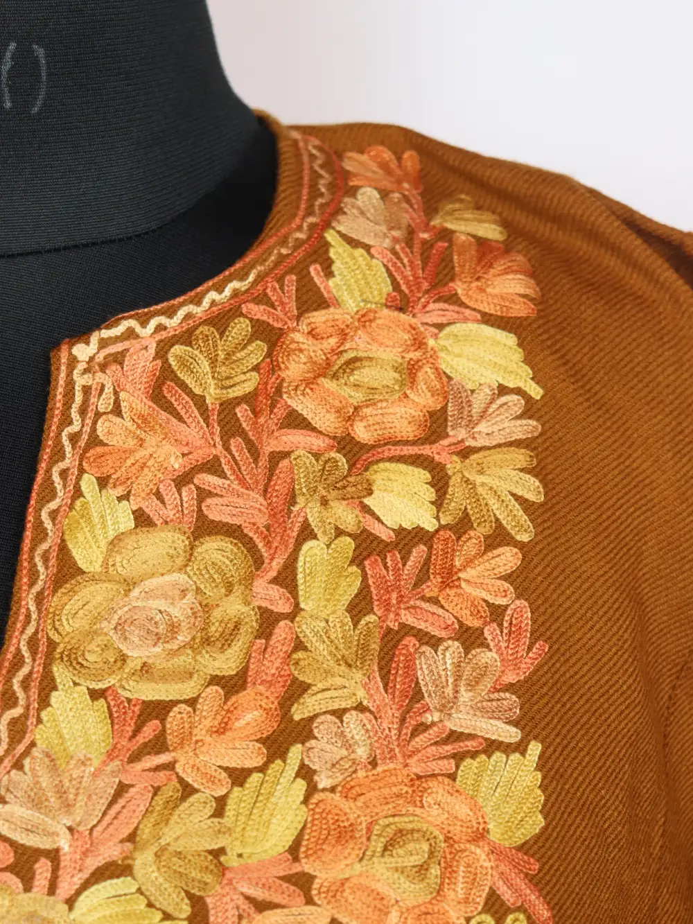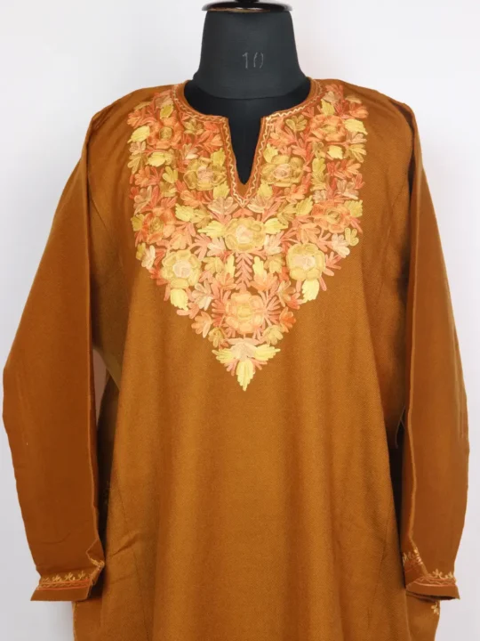 A mustard colour Kashmiri pheran crafted in Cashmilon Wool presents Aari embroidery in floral patterns at the neckline. It includes pockets on both the sides for function.