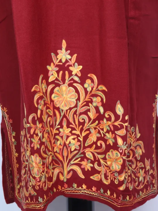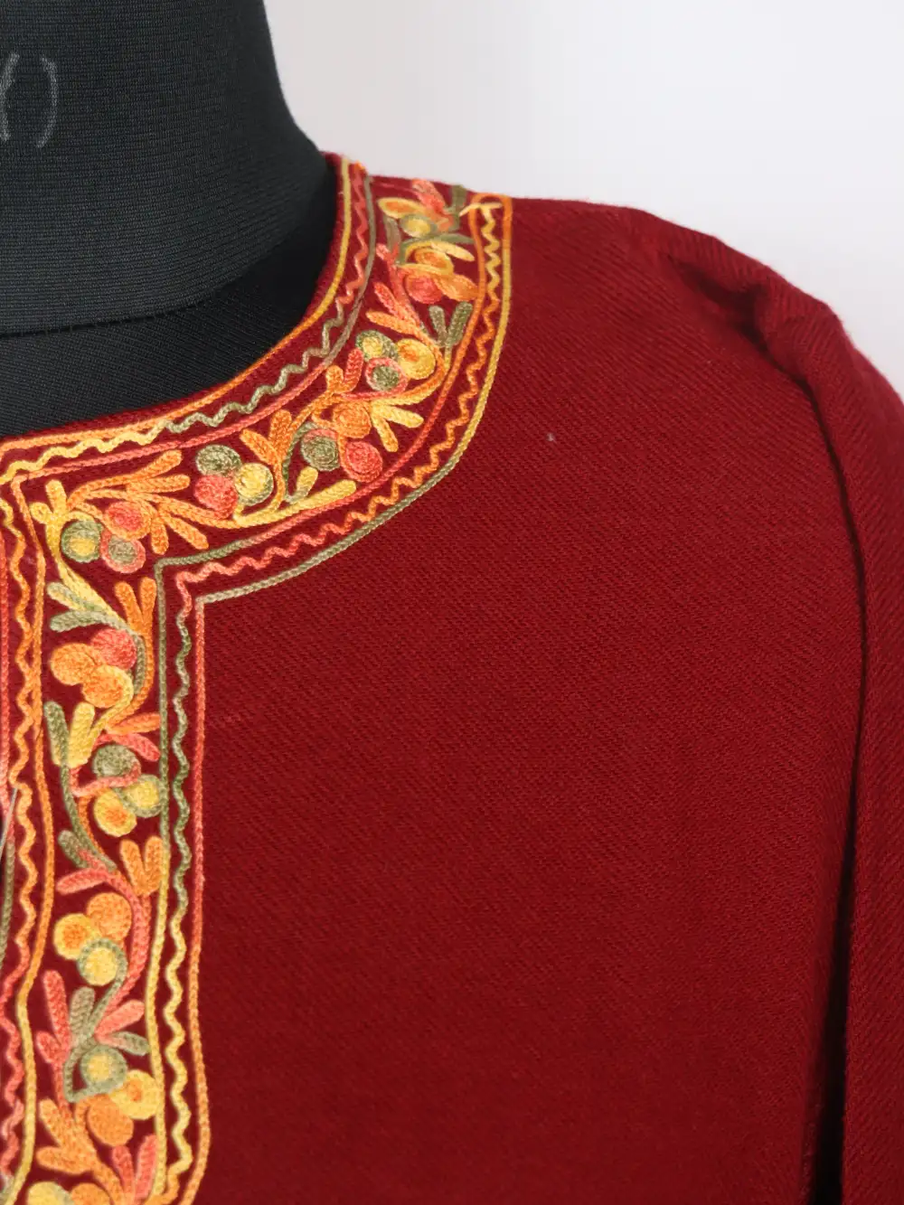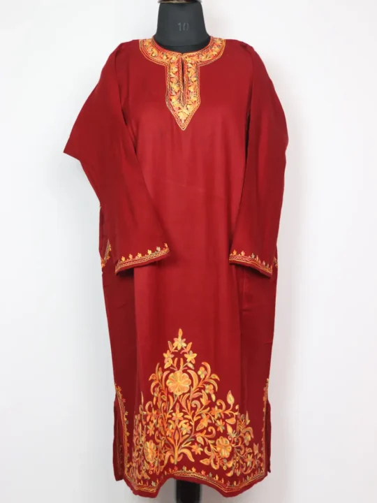 This faran has fine aari floral embroidery across the necline and detailed work at the badam, adding a gentle touch to its look. Elegant and warm, it’s a comfortable pick for daily winter wear.
