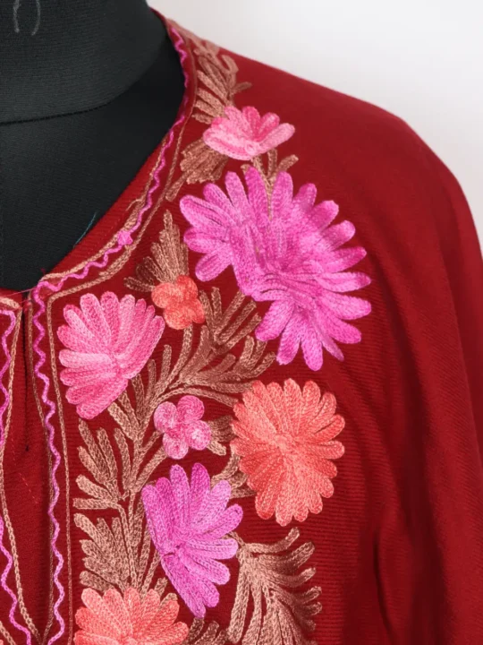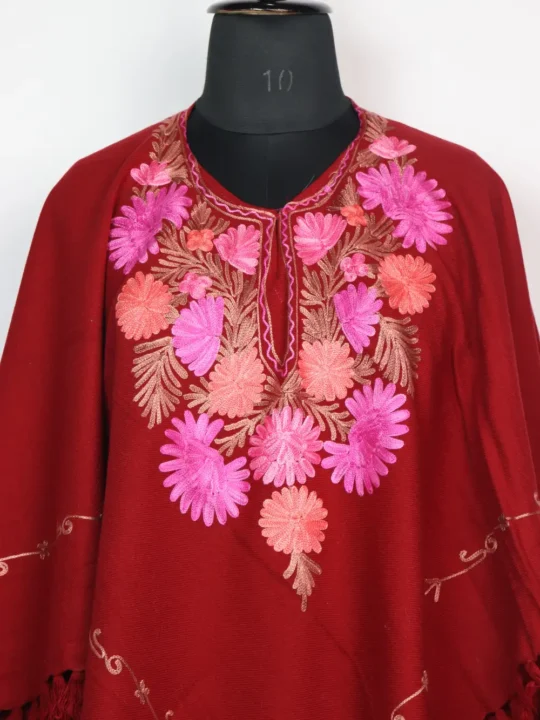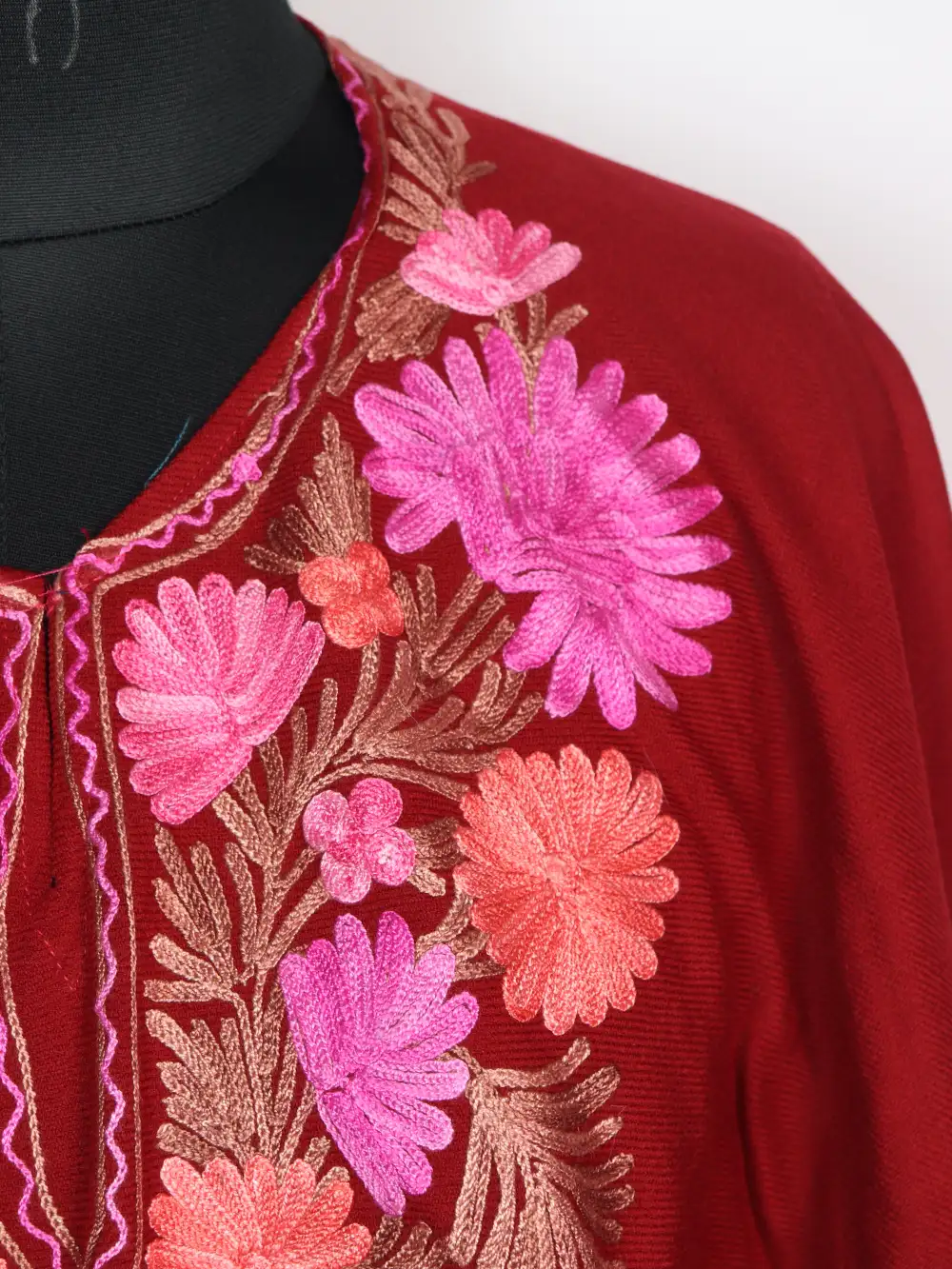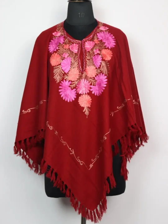 Crafted from Cashmilon wool, this poncho has garceful yet simple Aari flower emboidery near the neckline and along the lower border. It has a smooth fall and feels comfortable throughout the day.