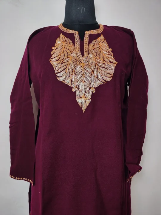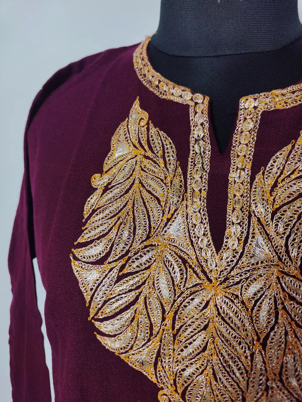 This maroon kurta set in cashmilon wool is designed to give you winter comfort with elegance. The neckline carries tilla embroidery that brings out silver floral motifs. As a two-piece set, it comes stitched so you dont have to tailor it your own, which makes it both graceful and versatile.