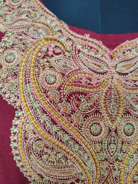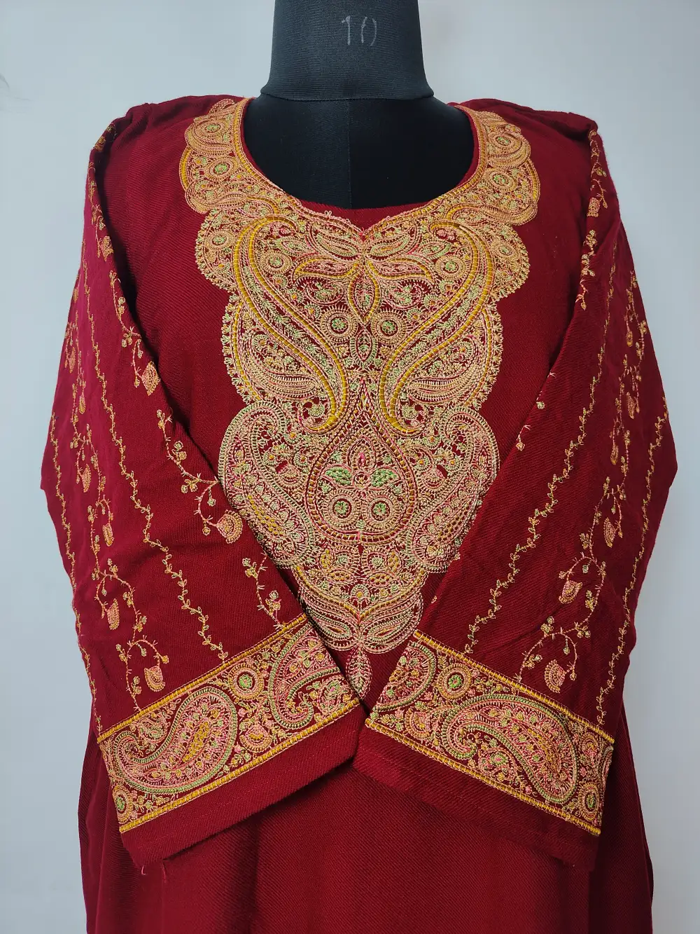 A maroon soft cashmilon wool 3pc pheran set, including pheran, trouser, and dupatta., finished with Sozni embroidery. The neckline has badam floral motifs while vine florals extend across the fabric. This embroidery style makes the piece stand out in quiet elegance. It is a practical yet beautiful option, it offers both warmth and sophistication for winter days.