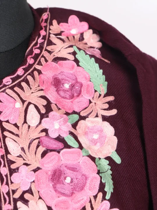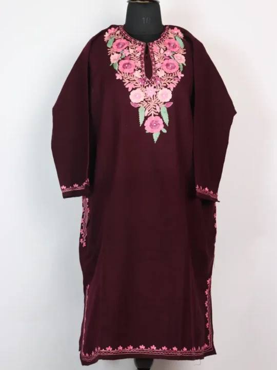Designed for women, this wine hue cashmilon wool pheran carries beauty in simplicity. The neckline embroidery in Aari, features pink floral with green leaves motifs, which highlight its elegance. Its fabric keeps the body warm while being light enough for daily use. With its graceful design, it can be styled casually or paired for small gatherings. It is a dependable garment that blends comfort and charm, makes it perfect for winter wardrobes.