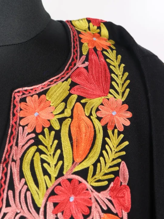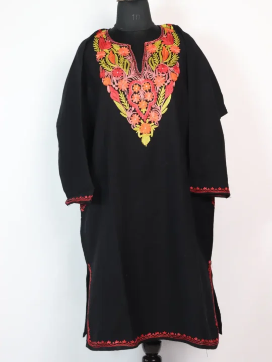 This black pheran crafted from cashmilon wool brings gentle elegance to winter wear. Its embroidery focuses on red florals and huge badams at the neckline enhances with green leaf motifs. It is easy to wear and comforting in texture, it allows warmth to be paired with decorative detail. A perfect balance of practical use and subtle refinement, making it a reliable seasonal choice.