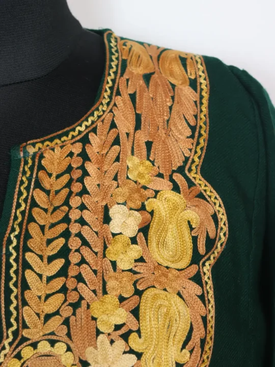 Made using cashmilon wool for softness, this faran comes in dark green colour. It shows aari embroidery in floral lavender and badam patterns on neckline.
