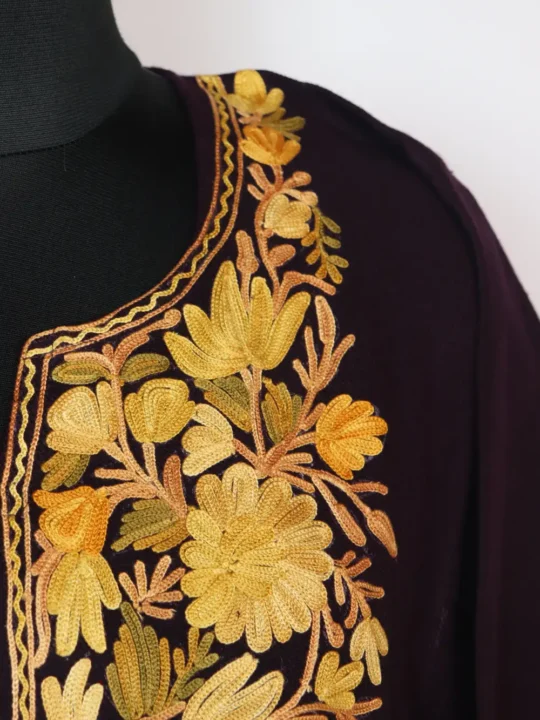 Cashmilon Wool Pheran in Wine with Aari Work Nisha