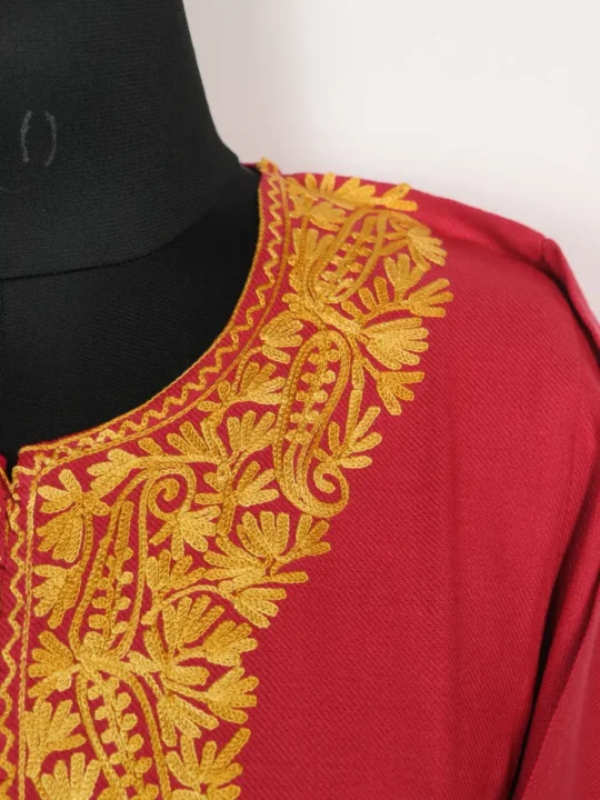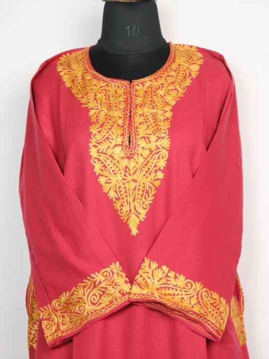 Pink colour Kashmiri phiran made in cashmilon wool fabric shows Aari embroidery at neckline, sleeves and border in vine badam motifs. It includes pockets both side for convenience.