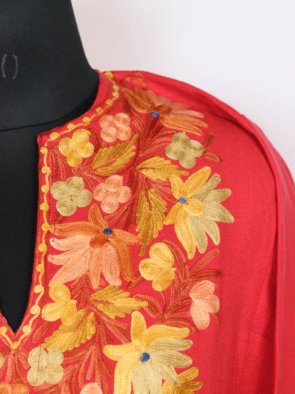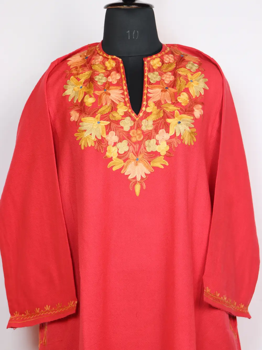 Cashmilon Wool stylish Kashmiri pheran in pink hue features Aari embroidery at the neckline in floral motifs and a calm relaxed fit because of its chest size 52 inches and length 42 inches which give generous fall.