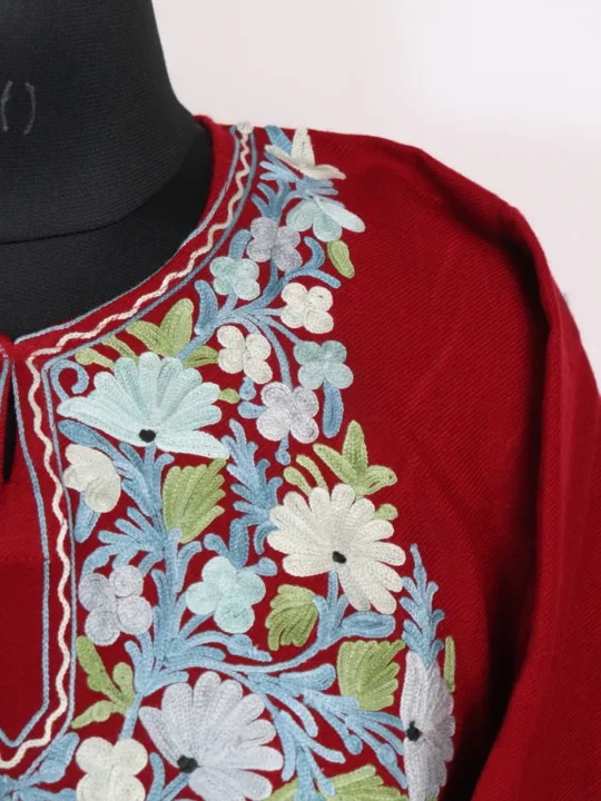 This is an elegant Kashmiri Pheran crafted from warm, comfortable cashmilon wool in a red color. It features intricate floral Aari embroidery that beautifully adorns the neckline and sleeves. This stylish piece is designed for comfort and warmth, and includes functional side pockets.