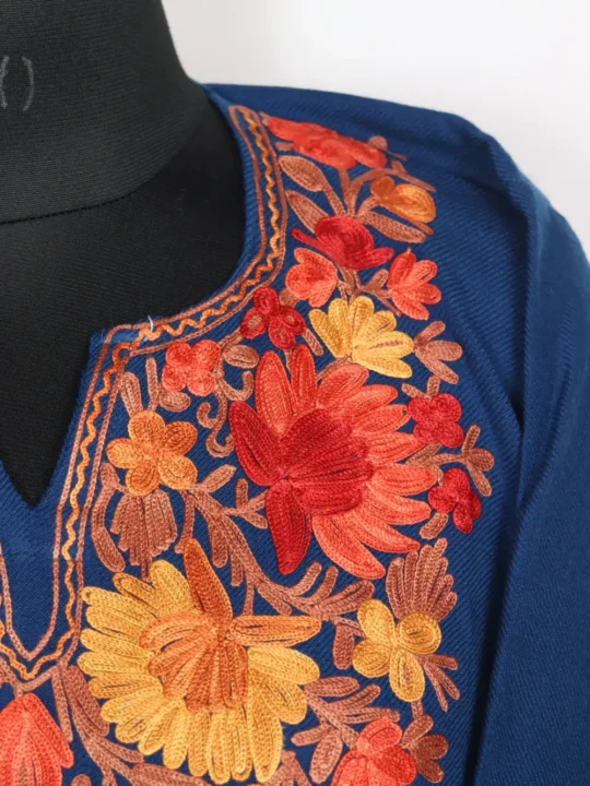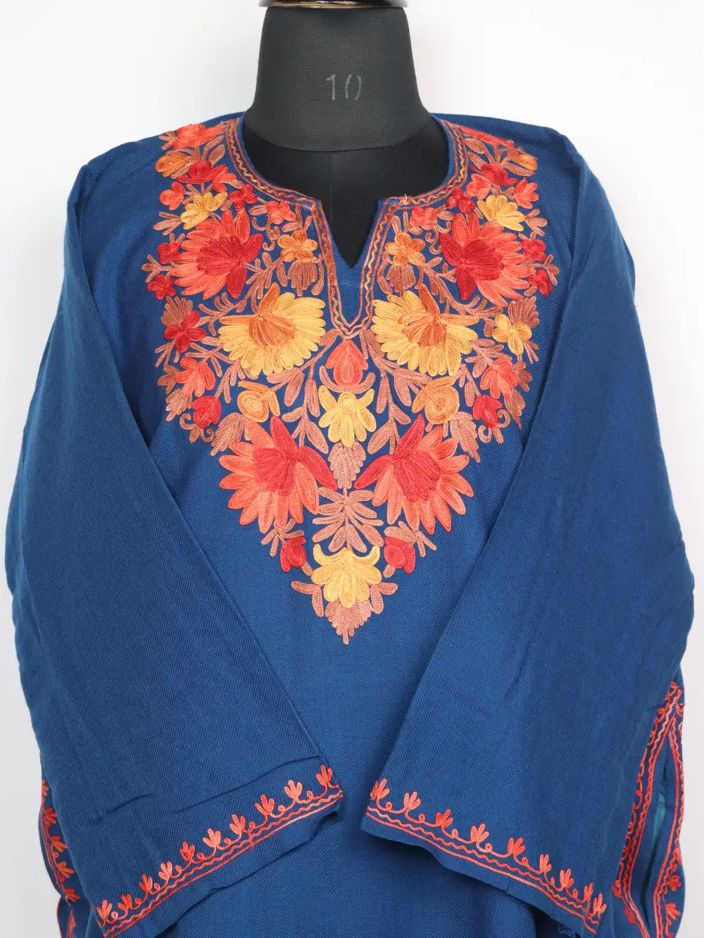 This royal blue Kashmiri phiran dress made in Cashmilon wool has refined work done on it. It includes pockets both side for on-the-go convenience. Its neckline has been detailed with Aari embroidery where floral motifs lift this piece.