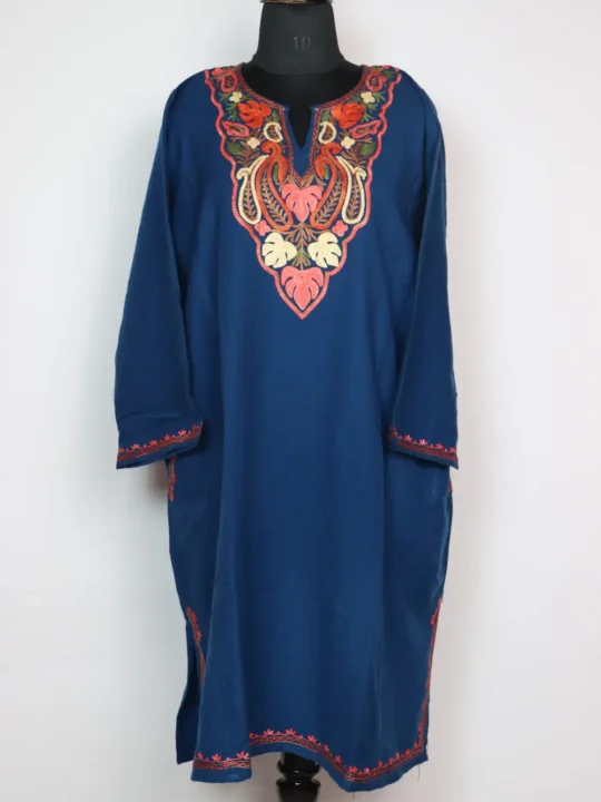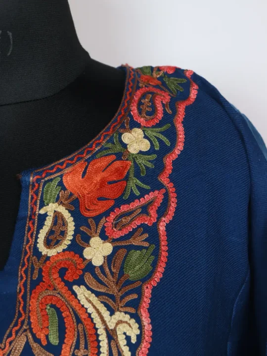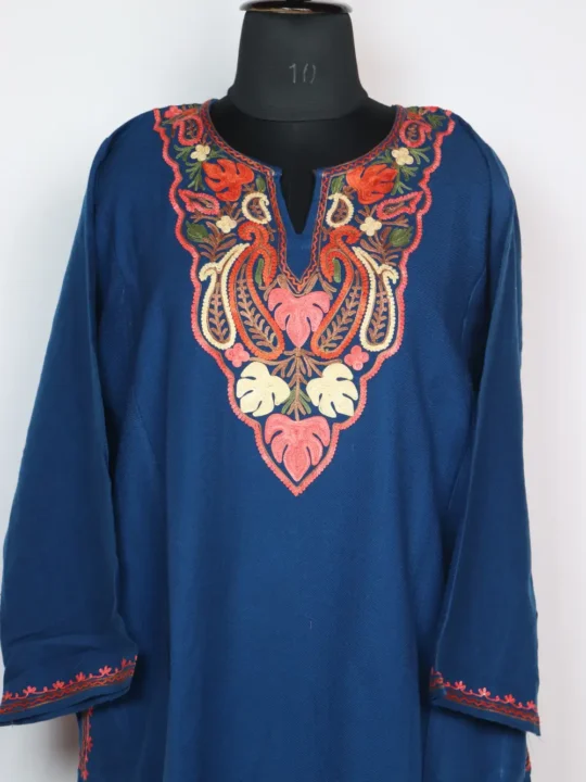 Crafted from soft Cashmilon wool, this dark blue pheran showcases detailed aari embroidery of badam and chinar motifs, adding a regal charm to its traditional design. It features two side pockets for comfort and style.