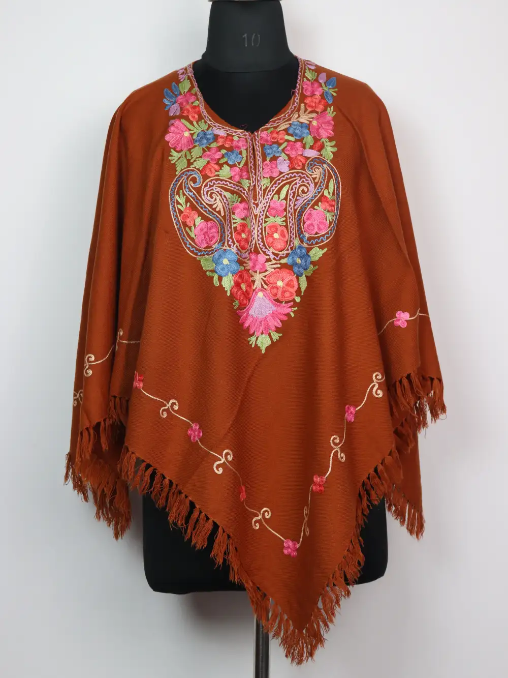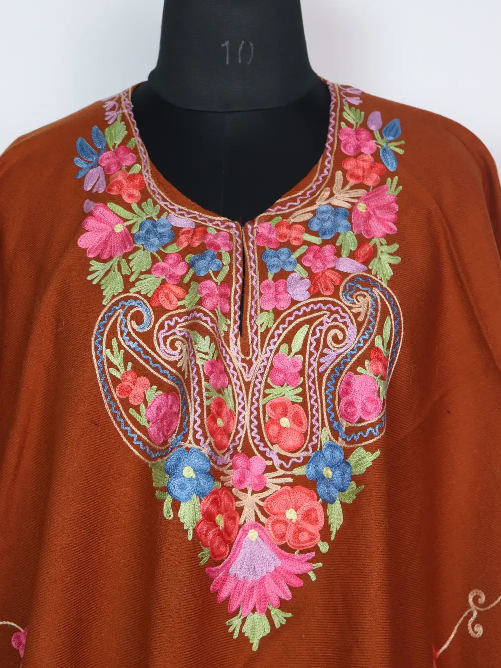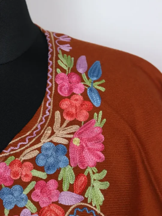 This beautiful rust color poncho comes in soft Cashmilon wool and has fine Aari badam and floral motifs that highlights the neckline nicely. The bottom edge is also embroidered, giving it a clean finished look.