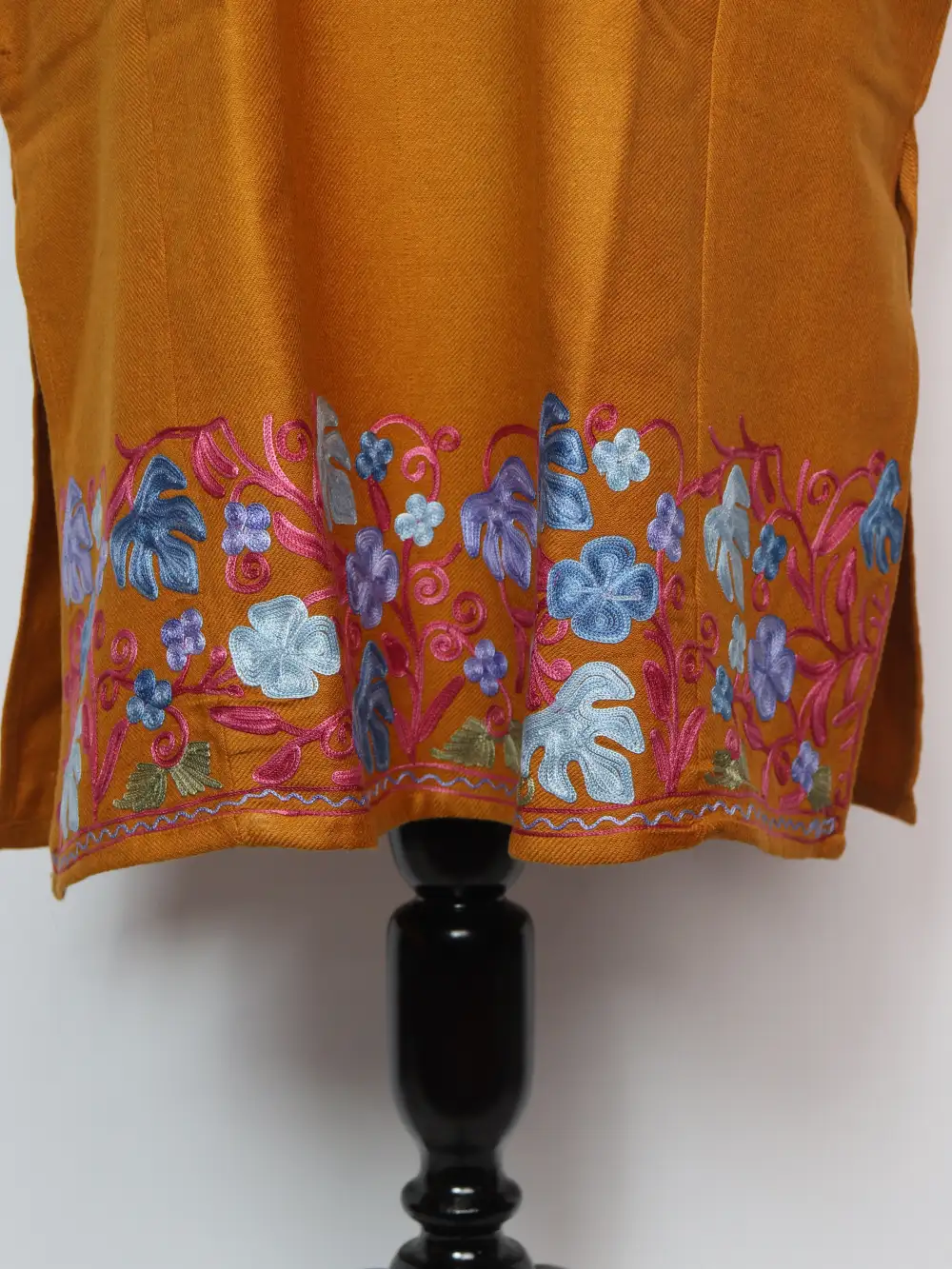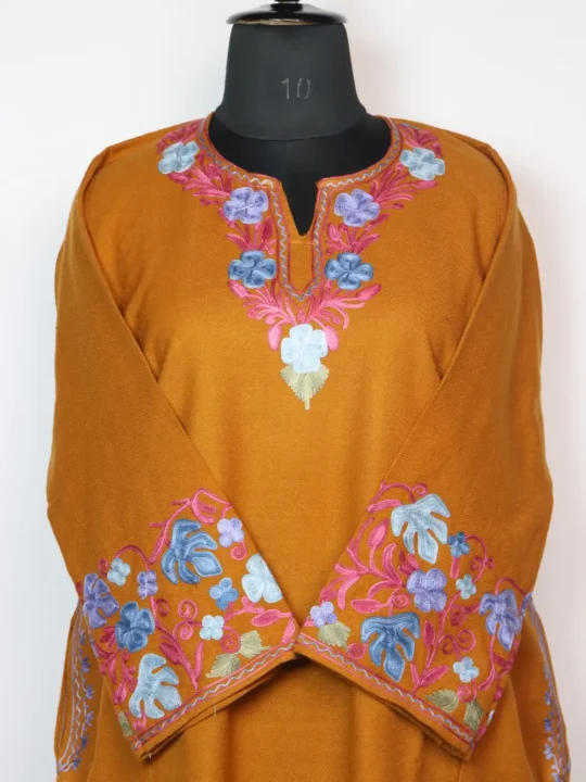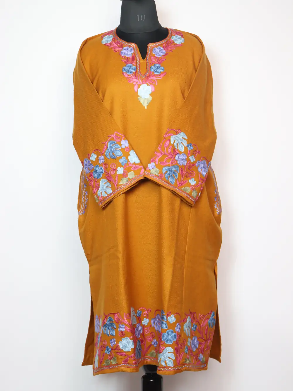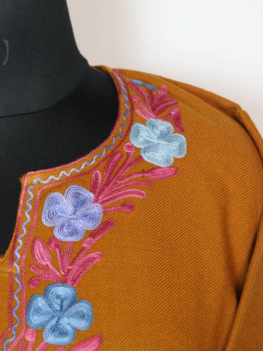 Stylish rustic orange Kashmiri feran dress stitched in Cashmilon wool highlights floral embroidery at neckline, sleeves and daman. It comes with chest size 51 inbches and length 43 that gives a roomy fit.