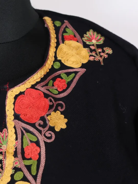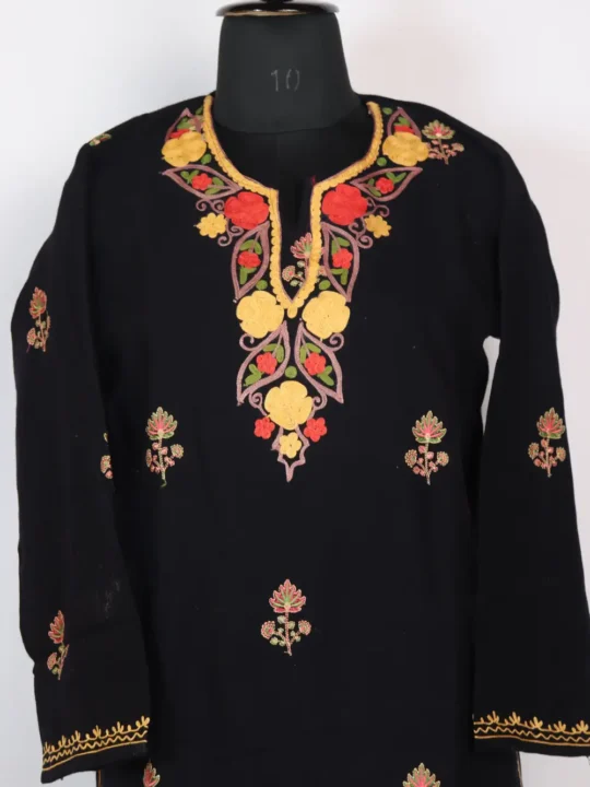 This black color kurti in cashmilon wool fabric embodies comfort and beauty. The neckline has been embellished with floral motif Aari embroidery in red and green and mustard color threads, and those bootis have been sewn in magenta-green color sozni threads that are sprinkled throughout the body. Its softness to wear and its embroidery add beauty to the design. It has been perfected for everyday wear in cold weather, it combines functionality with elegant trim.