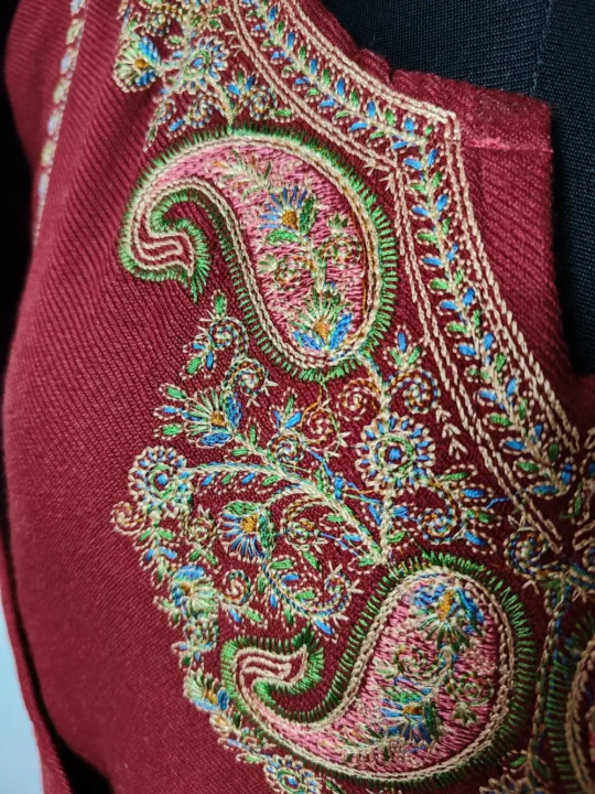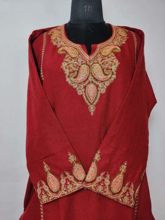Soft in texture and warm in feel, this red kurta set in cashmilon wool carries the finesse of Sozni embroidery. Its neckline, sleeve and trouser cuffs and border showcases badam motifs stitched in pink and green outline threads and floral motifs spread around it. The design brings a natural touch of elegance while staying simple. Perfect for everyday wear in winter, it captures comfort and style in one timeless