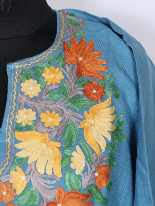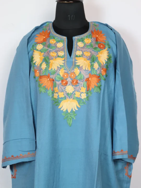 A warm, blue Cashmilon wool pheran carries floral Aari kadhai around the neckline. The Kashmiri pheran dress includes pockets on both sides — it reads crafted, wearable, and comfortably Kashmiri for daily winter wear.