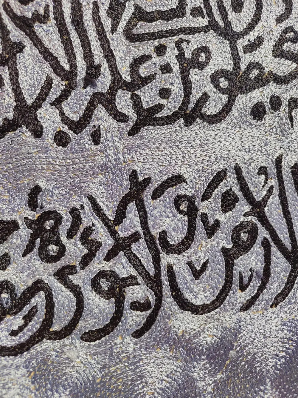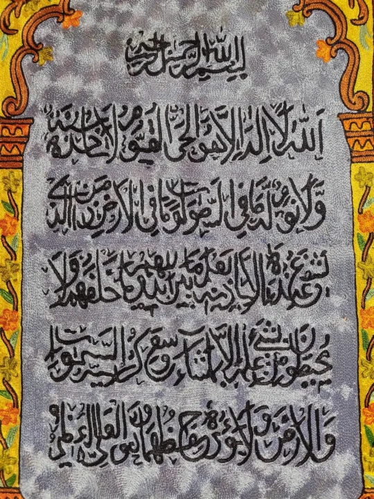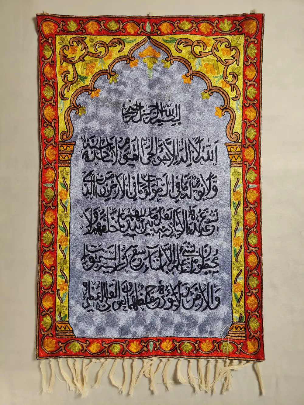 This Kashmiri wall hanging showcases the complete Ayat-ul-Kursi embroidered in silk chain stitch on dusoot cotton. The script appears in black against a dark grey base, framed with curved and floral motifs in soft green and yellow threads. A blend of spiritual expression and artistry, it makes a meaningful decor piece—reflecting both Kashmiri skill and timeless reverence through its fine detailing.