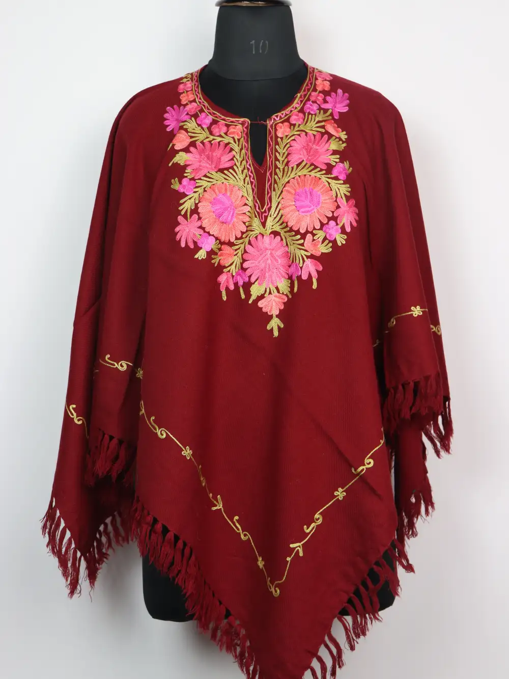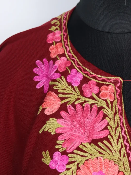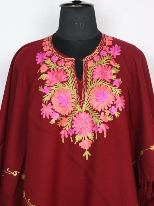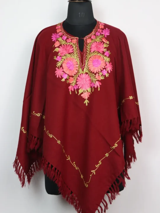 This poncho comes in Cashmilon wool and with fine floral Aari work at the neckline and the border. It feels warm and comfortable, good for daily winter wear.