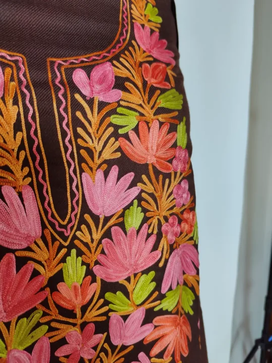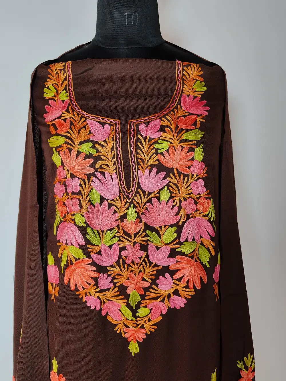 A chocolate brown colour 3pc salwar kameez suit in polywool carries floral white Aari at the neckline and arrives as a 3pc set with salwar, kameez and dupatta that come unstitched for tailoring to your own fit.