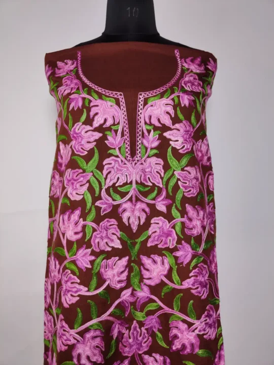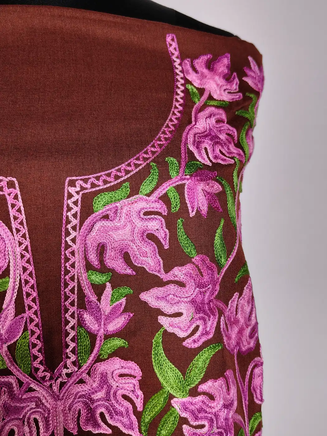 The chocolate brown base keeps this 2pc kadhai suit elegant. It comes unstitched, so you can tailor it to your desired fitting and pattern. Sometimes embroidery alone make the biggest impact. Its chinar aari embroidery in jaal pattern enhances all-over the summer cool cotton fabric.