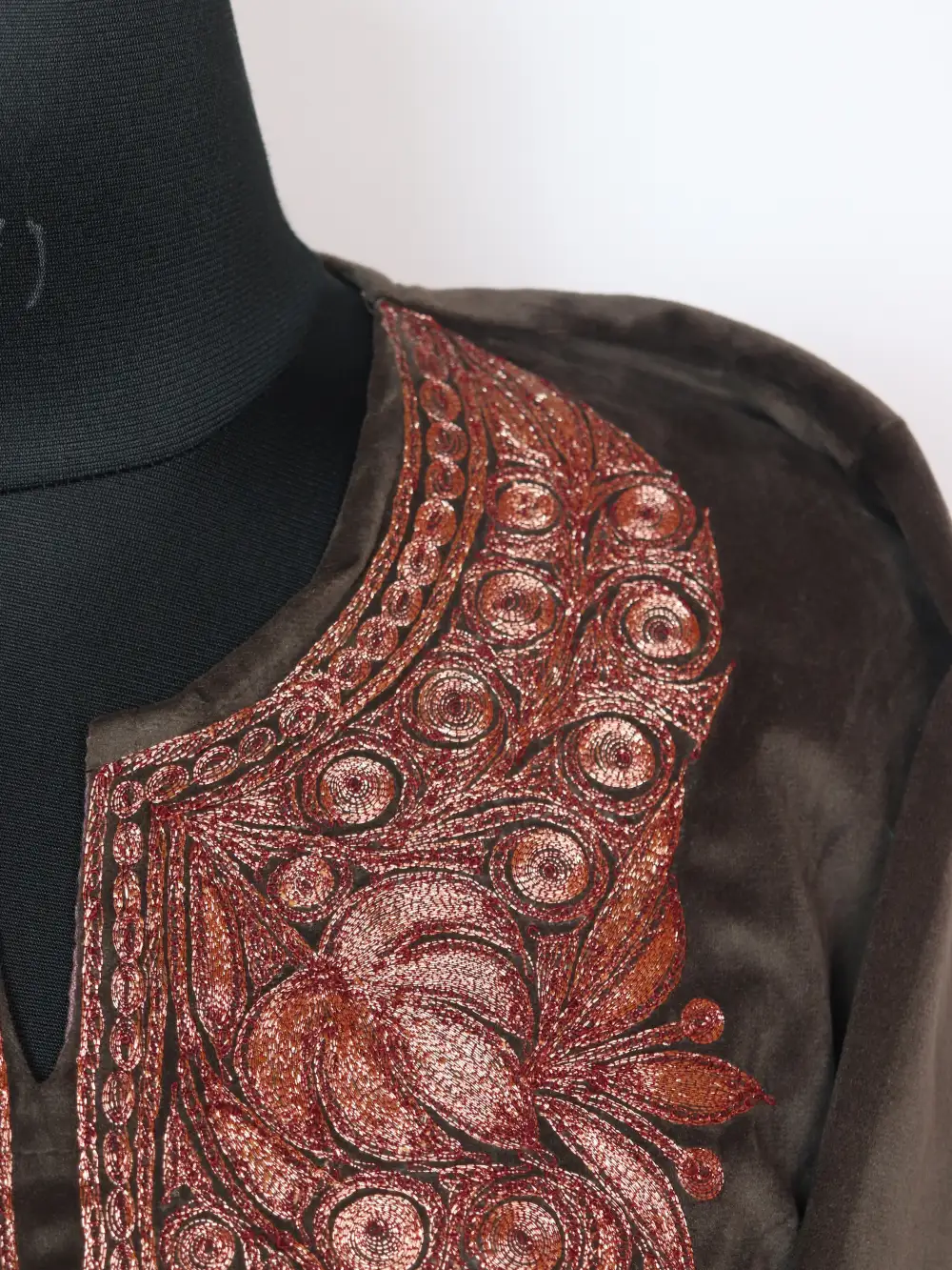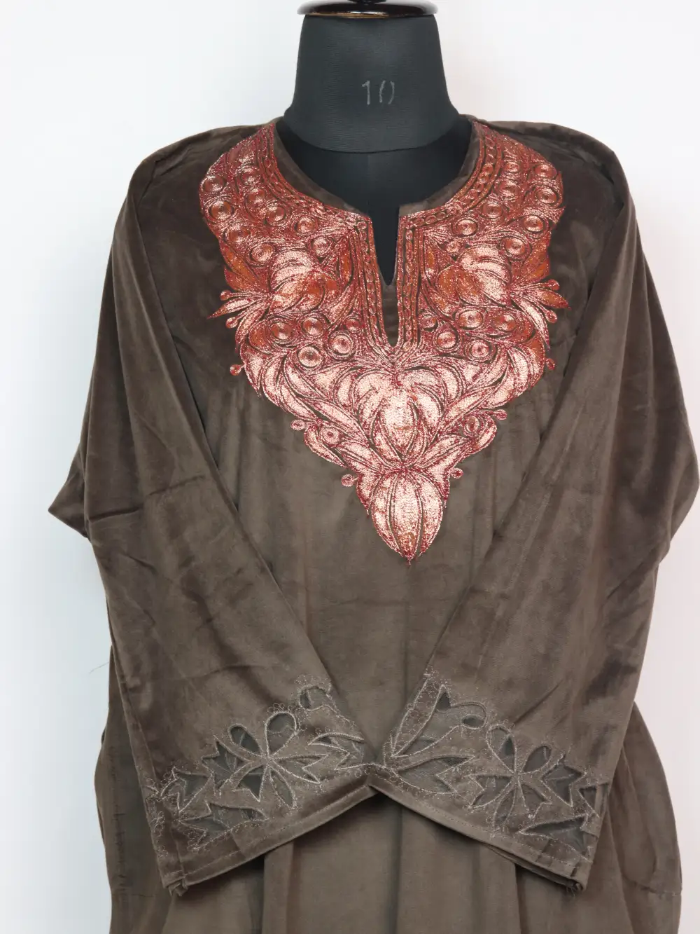 A chocolate brown colour pheran in Velvet shows botte Tilla embroidery at the neckline and it comes with pockets on both the sides for practical use.