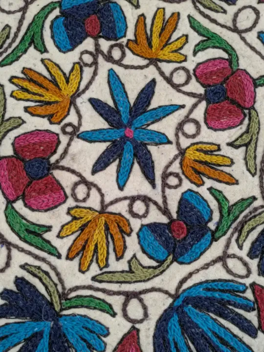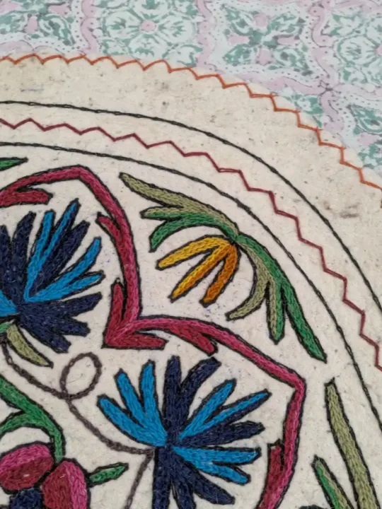 This exquisite circular wool Namda is a perfect embodiment of Kashmiri craftsmanship. It is decorated with intricate Hand Aari embroidery, it features stunning blue chinari and geometric patterns that symbolize the valley’s rich culture. Its soft wool material offers warmth and comfort, making it ideal for cozy corners or as a centerpiece in your living room. Its unique round shape brings a touch of modernity while staying rooted in tradition. Let this Namda add elegance, beauty, and cultural significance to your home.