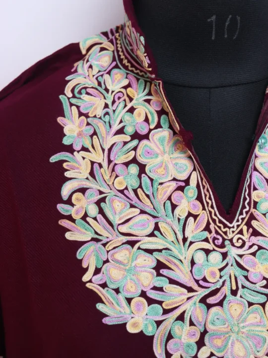 A magenta colour aari work kurta in Cashmilon Wool features Aari kaam at the neckline and holds an elegant accent. It comes in chest size 46 and length 39 inches which deliver a comfortable, balanced fall.