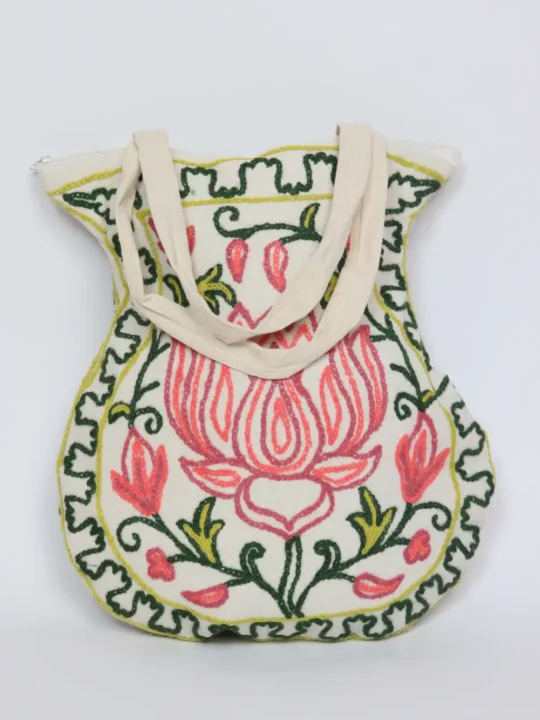 This bag is the perfect accessory who love to travel and shop. Its dusoot base features hand-embroidered flowers, crafted by skilled hands. Perfect for markets, cafes, or a quiet afternoon.