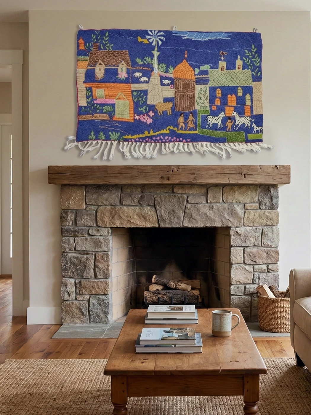 This wall-hanging in 3×2 ft size carries the essence of Kashmiri décor. The base is embroidered with manual weaving work using brown, orange, white, green and blue wool threads, creating striking motifs that instantly add depth and character. This wall-hanging features some buildings with brown roofs, orange domes, and white walls, and some horses in the foreground. And there we can see some people walking the lower part of the scene. The wall-hanging also showcases some plants in green and a dark blue night sky with clouds. Its strong cotton fabric keeps it light yet durable, while the embroidery makes it stand out as a cultural statement. A meaningful way to bring traditional craft into your interiors.