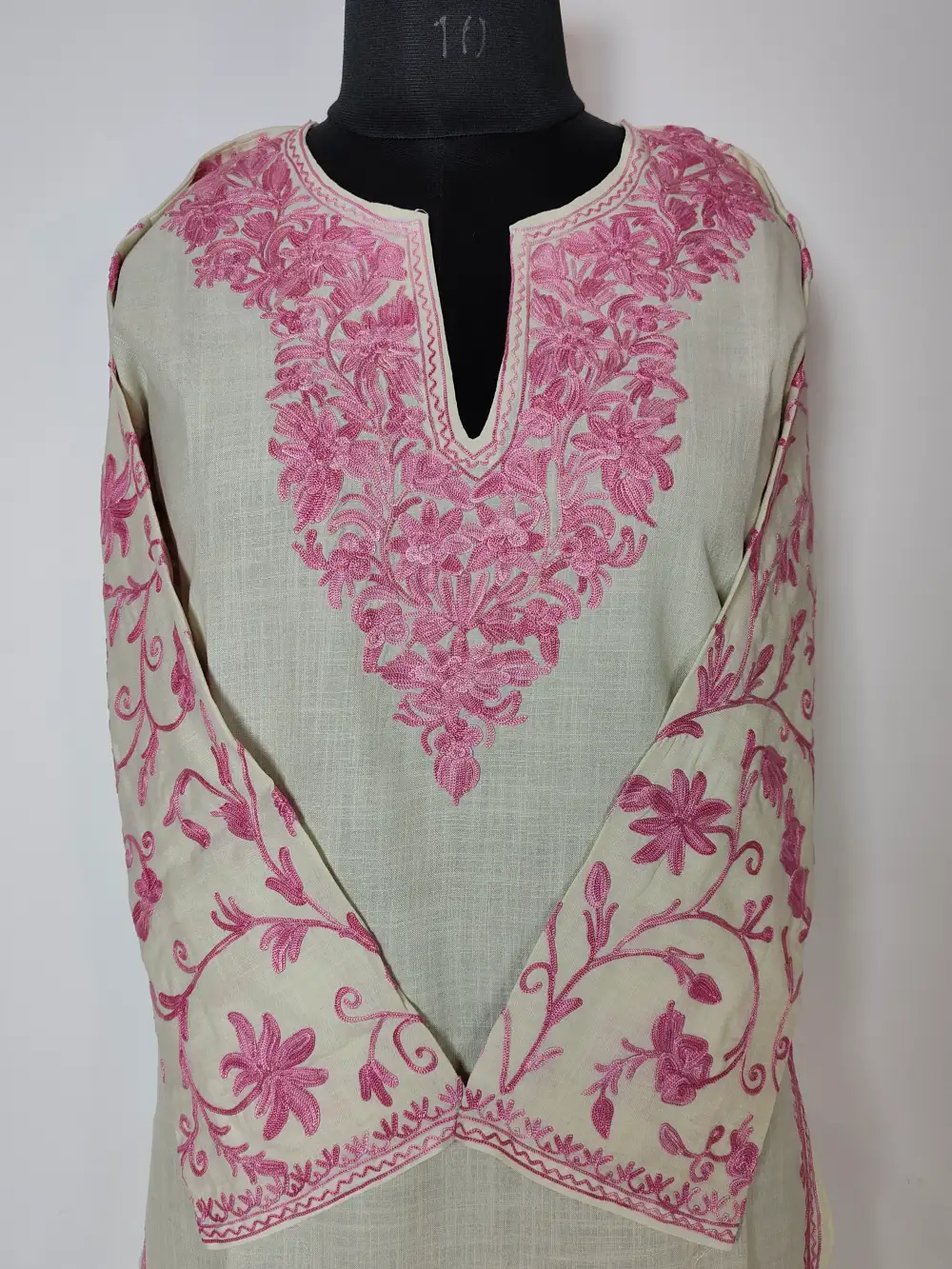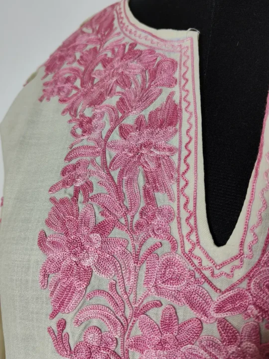 Made in breathable cotton, this kurti has beautiful pink Aari floral embroidery on the neckline and sleeves. Its chest measures 38 inches with a 38.5 inch length, giving it a relaxed long fit.
