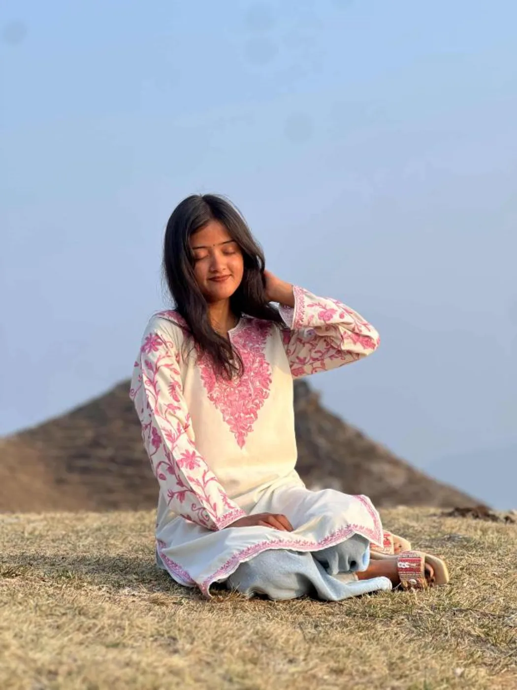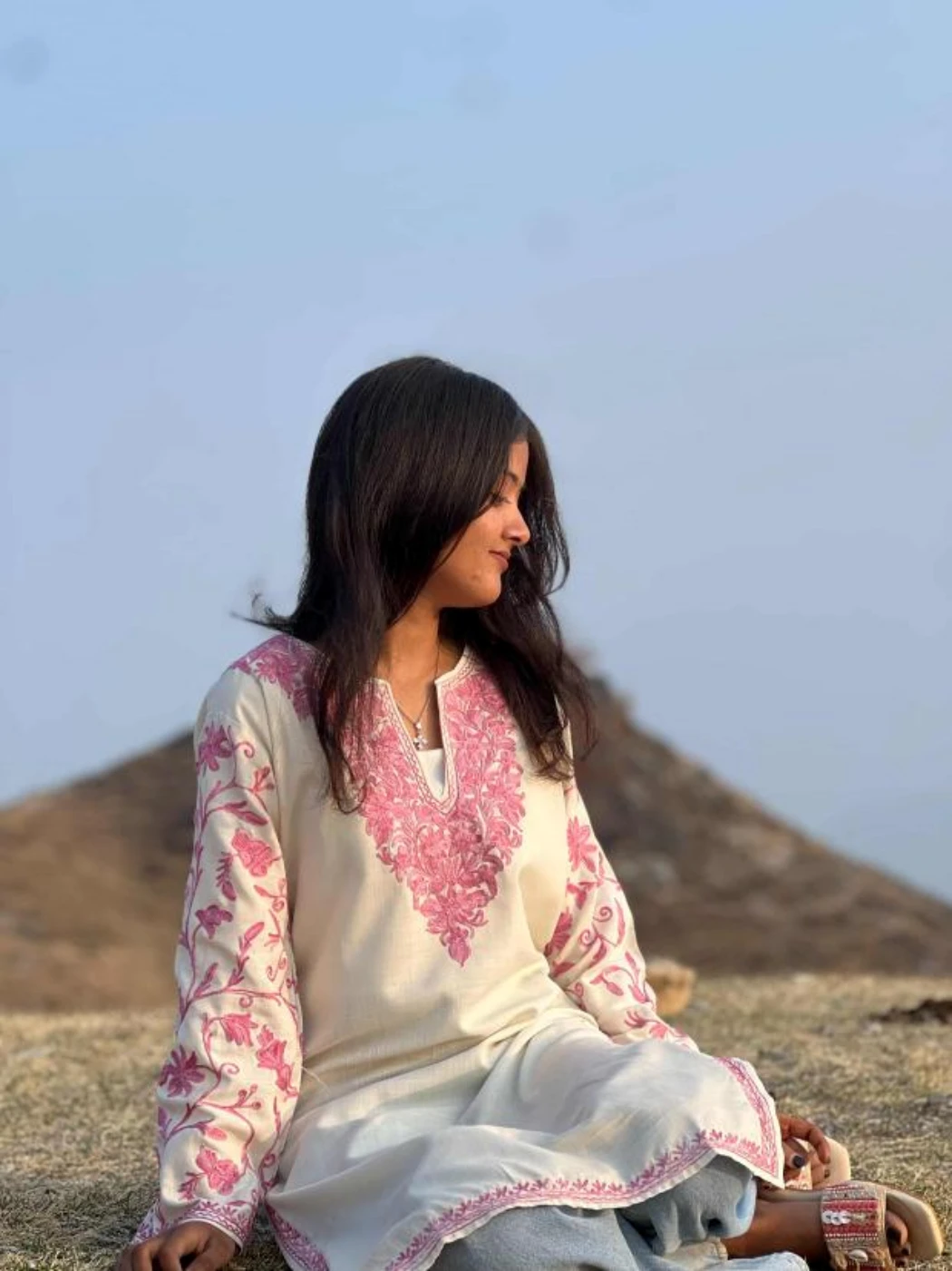 Made in breathable cotton, this Kashmiri kurti has beautiful pink Aari floral embroidery on the neckline and sleeves.