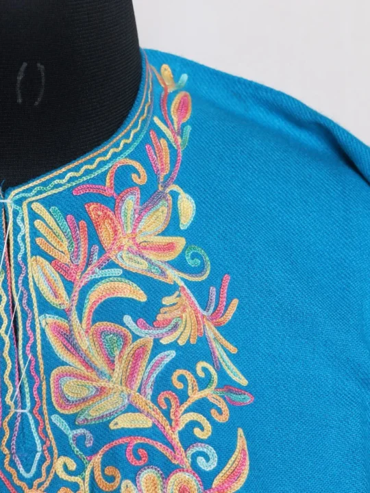 Make winters more special for you with this sky blue colored cozy short Pheran. It is designed to keep you warm and comfortable. This short pheran combines soft Cashmilon fabric with eye-catching embroidery. It is ideal for both casual outings and celebrations and it is the perfect mix of functionality and fashion. Don’t miss out, get this today!