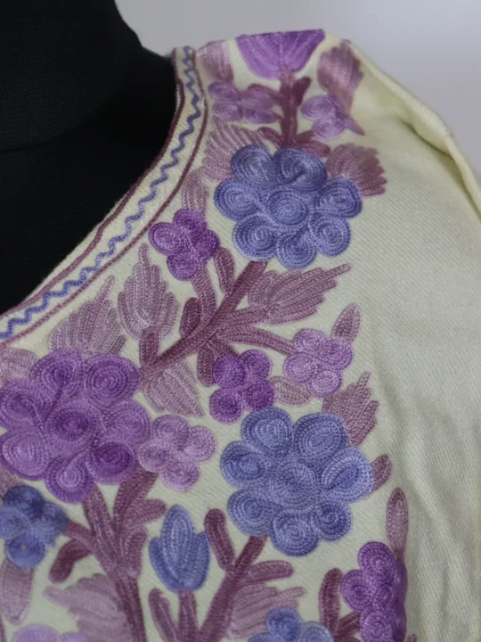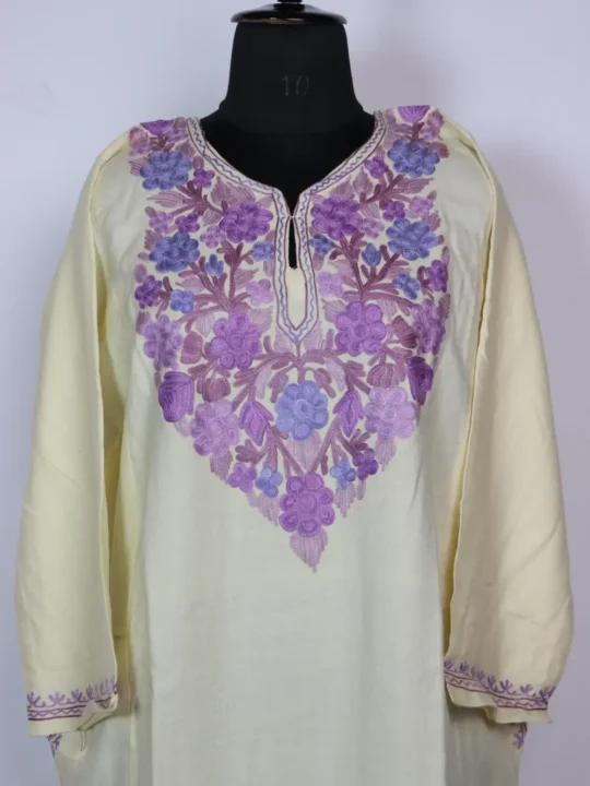 Made in Cashmilon Wool with Aari kaam done at the neckline with purple hue floral threads, this cream colour Kashmiri feran is sized to a 50 inch chest and 43 inch length and includes two side pockets for everyday use. This traditional piece places its detail where it shows most while keeping it relaxed and winter-ready. If you’re looking to buy phiran online, this piece is an easy, elegant pick to bring a little warmth into regular rotation.