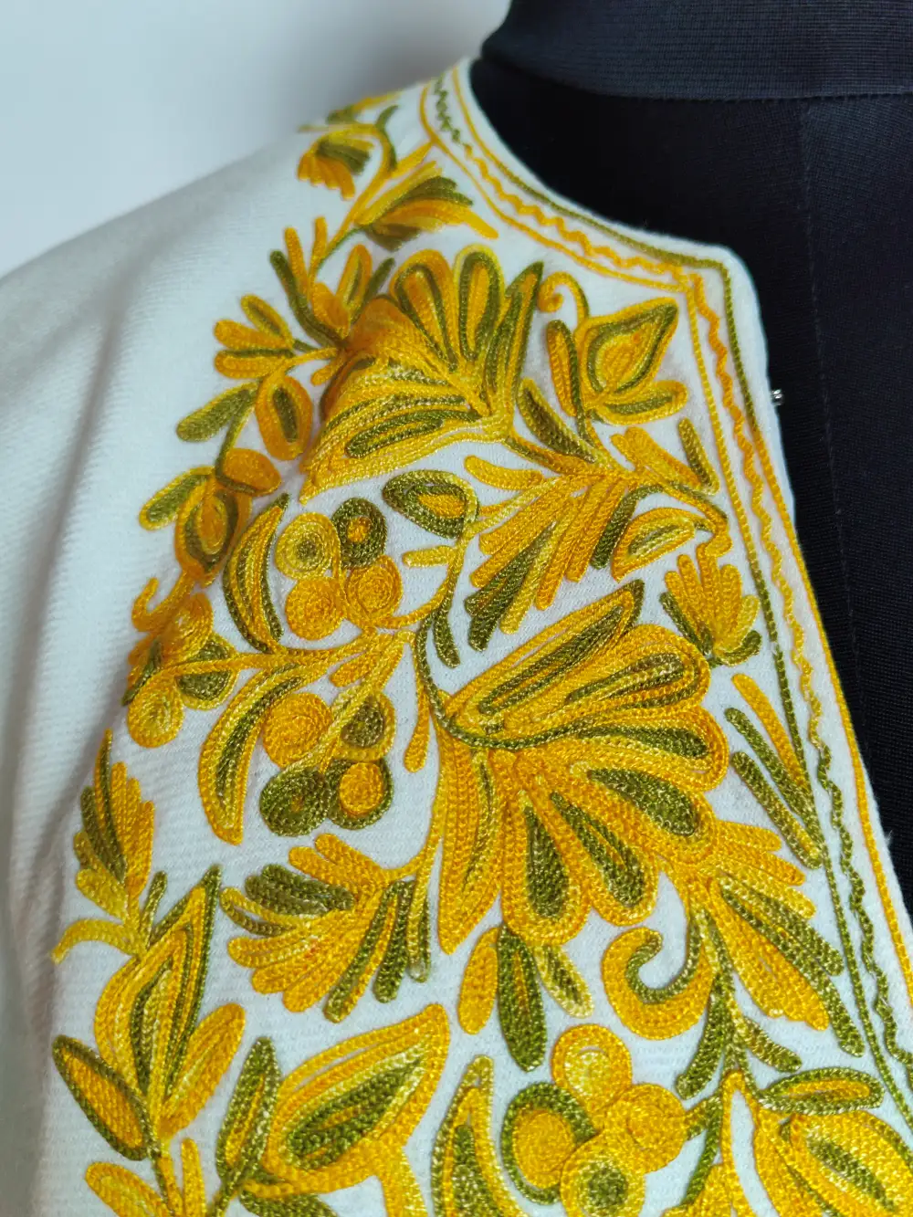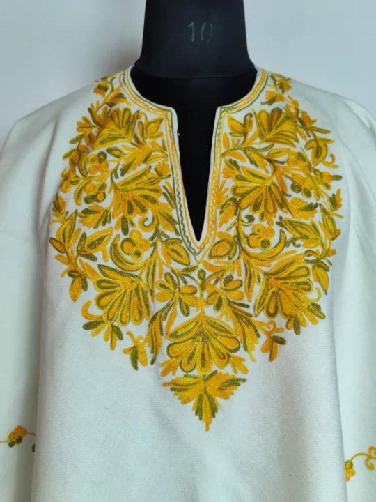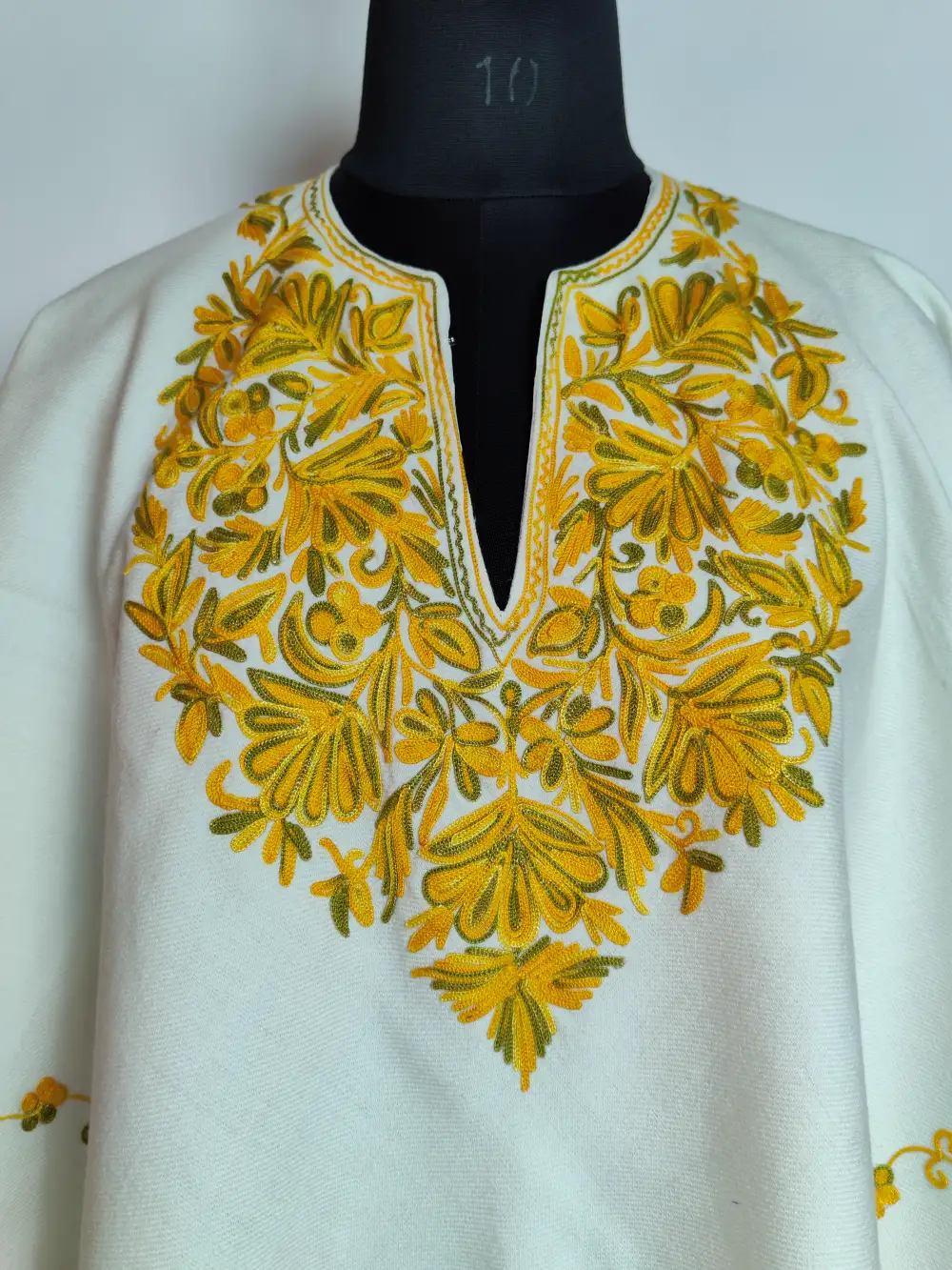 Cashmilon wool and floral Aari at the neckline with continuous near-border embroidery define this white Kashmiri poncho. Side-by-side it is 66 inches, its length 32 inches and it has lining included for a smooth feel.