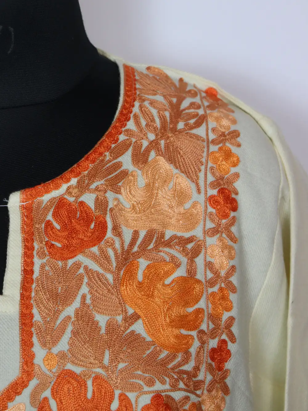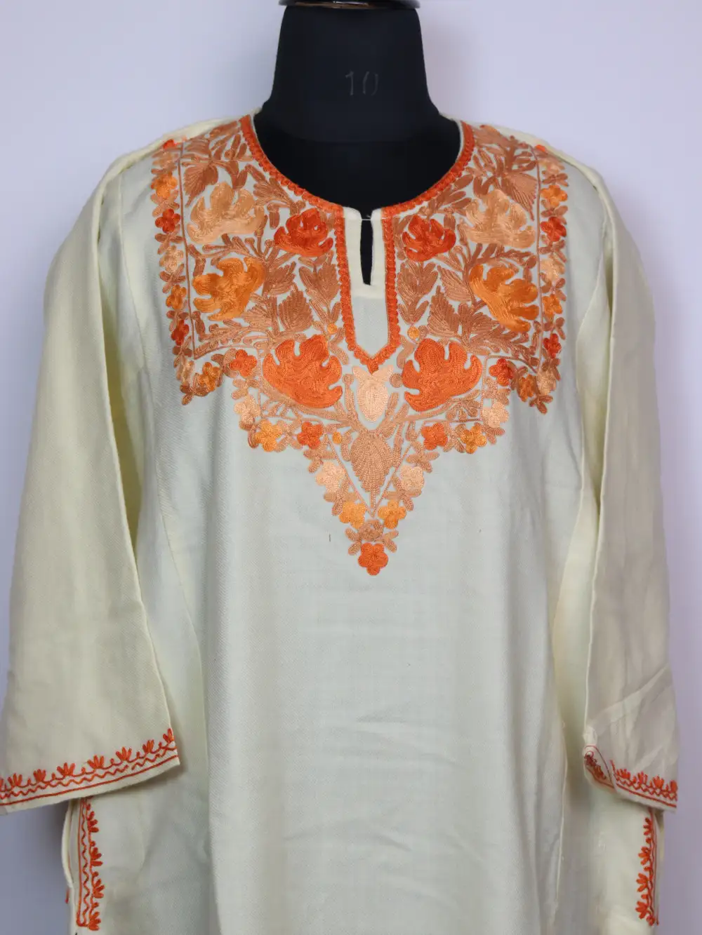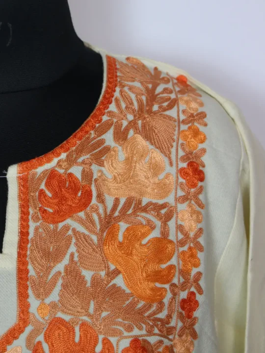 A warm cashmilon wool feran in a classic Cream color, where the chinar posh bagh neckline embroidery gives elegant shape to the overall look.