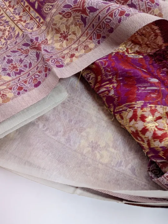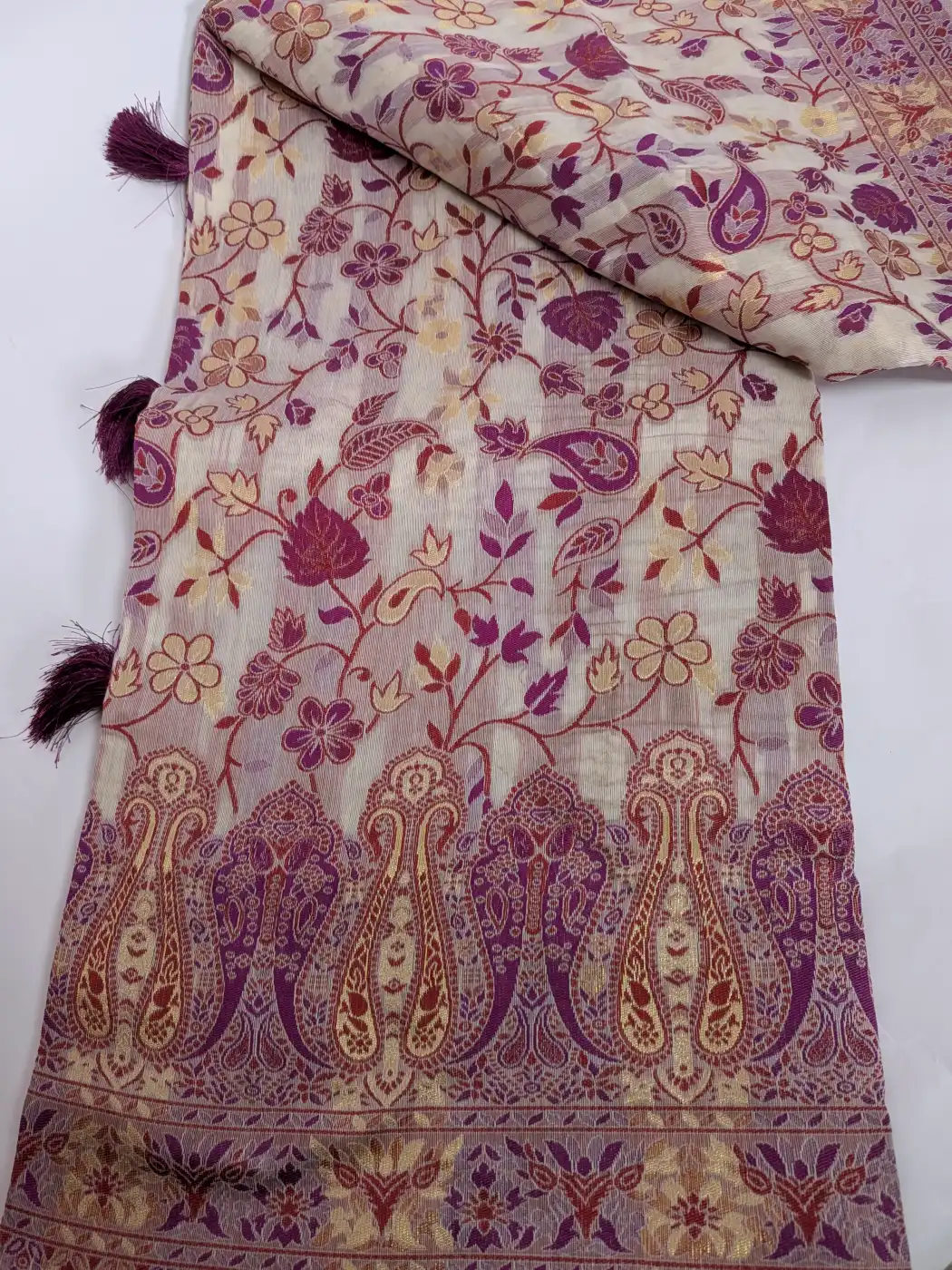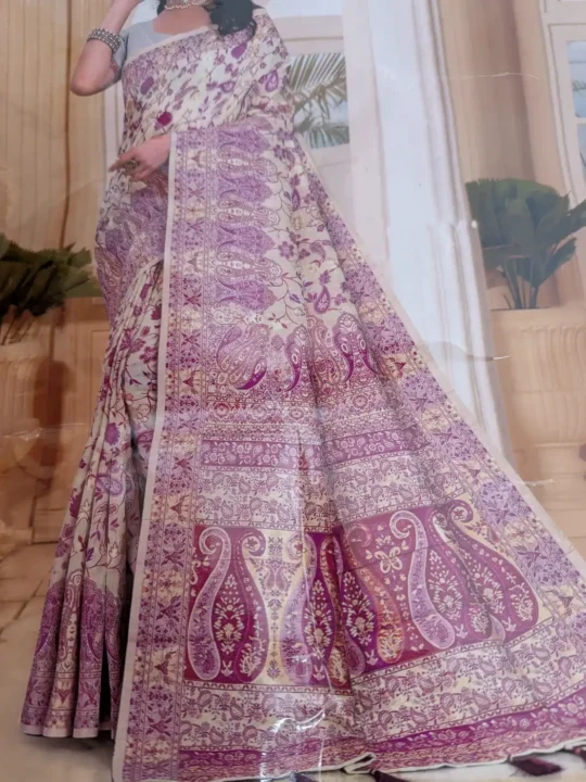 This beautiful cream and lavendar colour saree has been made in cotton silk, which finds true character in Kani craftsmanship. Its floral weaving flows throughout with measured precision, and is finished by a striking badam border. Elegant and poised, ithis kani saree speaks of heritage preserved in every woven detail.