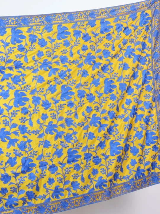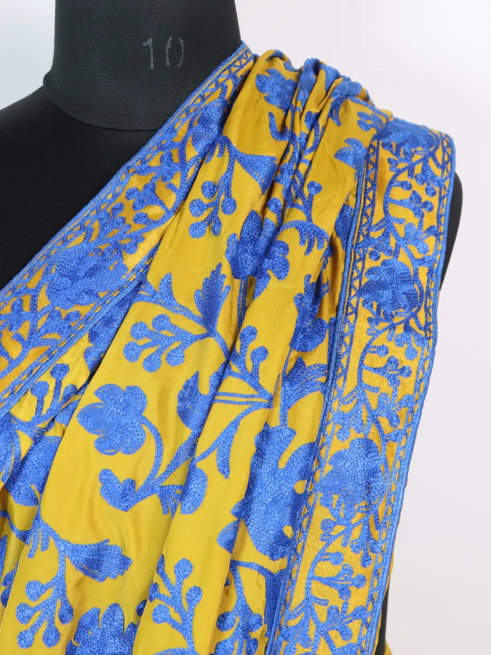 Light as air and beautifully detailed, this mustard color crepe saree carries chinar Aari motifs embroidered in blue across its pallu and border. The design draws from timeless inspiration, gives the saree a cultural touch while still feeling modern. Its soft drape makes it an easy companion for long hours, ensures you look polished and graceful for celebrations or casual get-togethers alike.