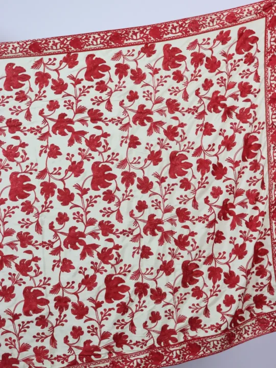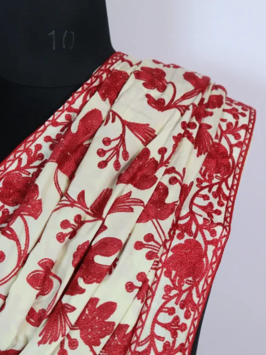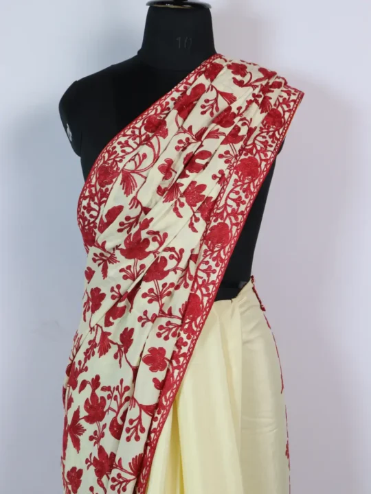This cream crepe saree brings a gentle elegance to your collection, detailed with chinar Aari embroidery in striking red. These motifs flow gracefully along the pallu and border, which creates a statement without overpowering the fabric’s lightness. It is easy to drape and fluid in fall, which makes it graceful pick for festive gatherings, evening wear, or family occasions where subtle tradition meets effortless style.