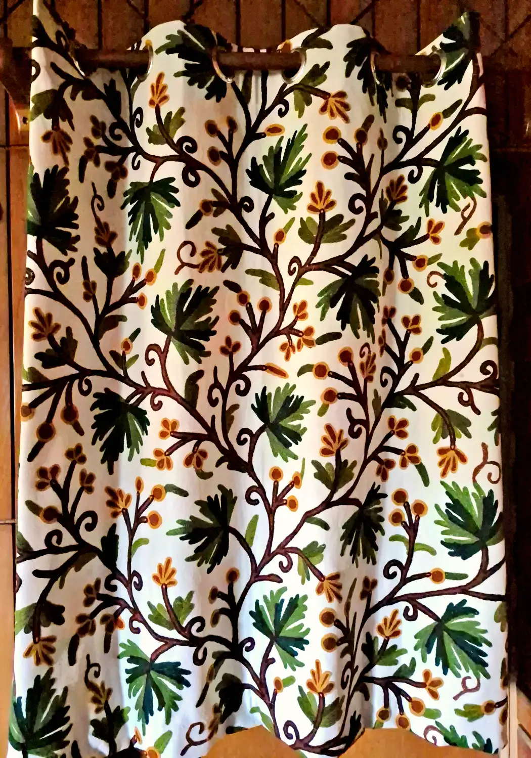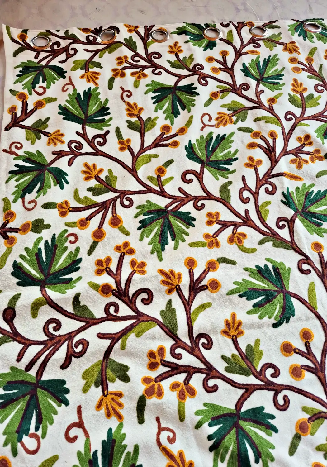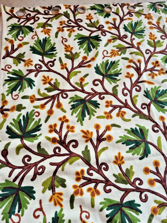 Chinar leafy motifs in green threads flow beautifully across this dusoot cotton curtain, giving it a soft traditional touch. Comes in 4×4 feet size, it fits compact spaces well. Detailed with aari work, this one piece is just rs 2499. This small curtain carries finely stitched green chinar leaf patterns which makes it a simple yet elegant addition to your space.