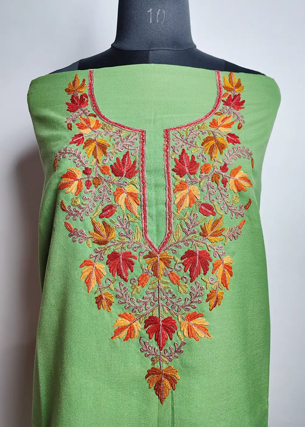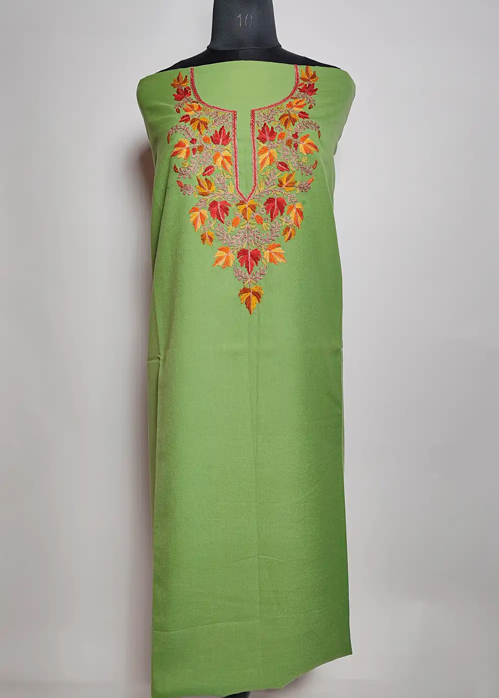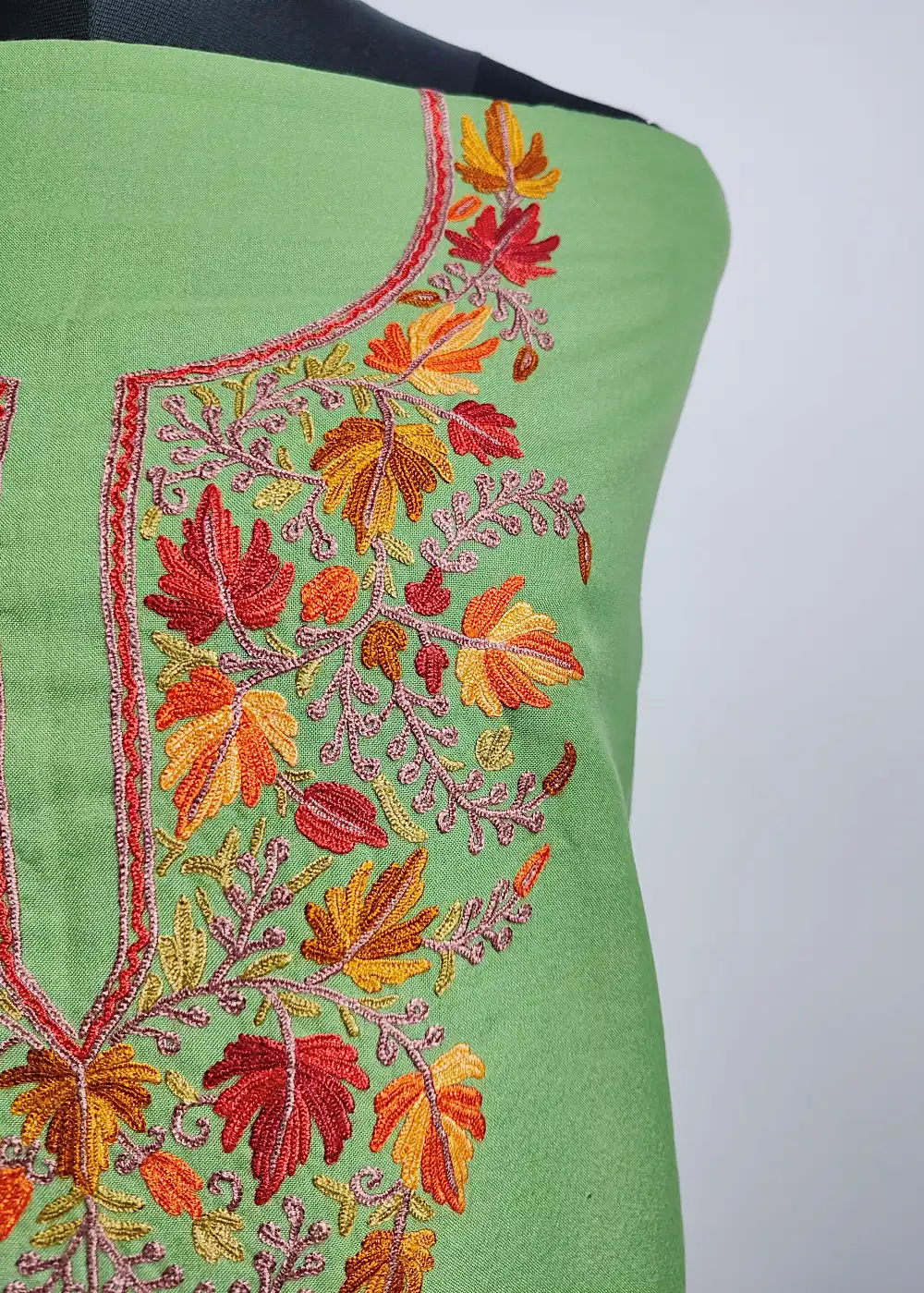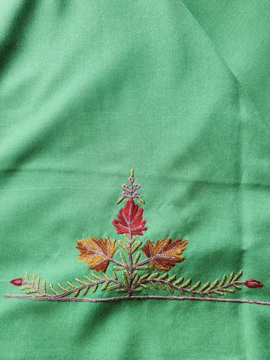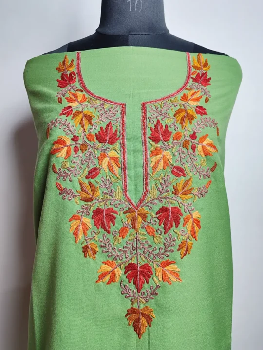 This cotton summer suits style 2pc set comes with graceful chinar bagh hand Aari work done around the neckline that adds a gentle traditional touch. A suitable Kashmiri salwar suit for daily wear, provided unstitched for custom tailoring.