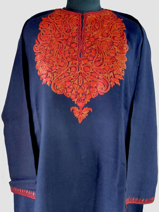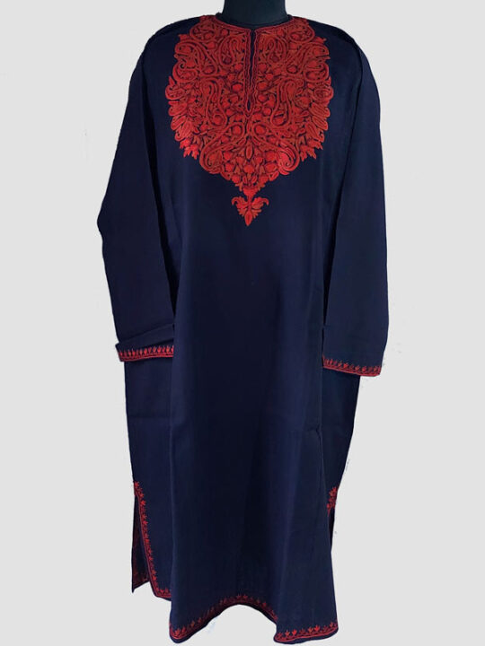 This beautiful Kashmiri winter pheran is made of pure raffal wool. The embroidery on it is aari work and is done by hand by our artisan.