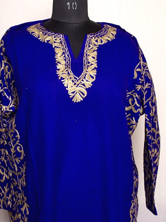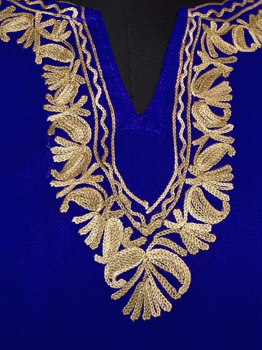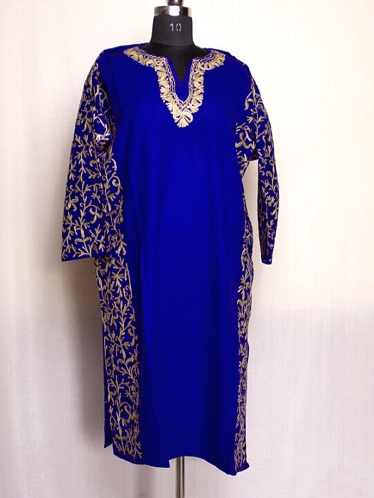 Dark Blue Cashmilon Sidepanel Pheran with Exquisite Aari