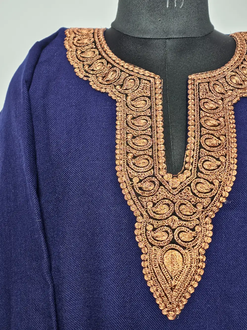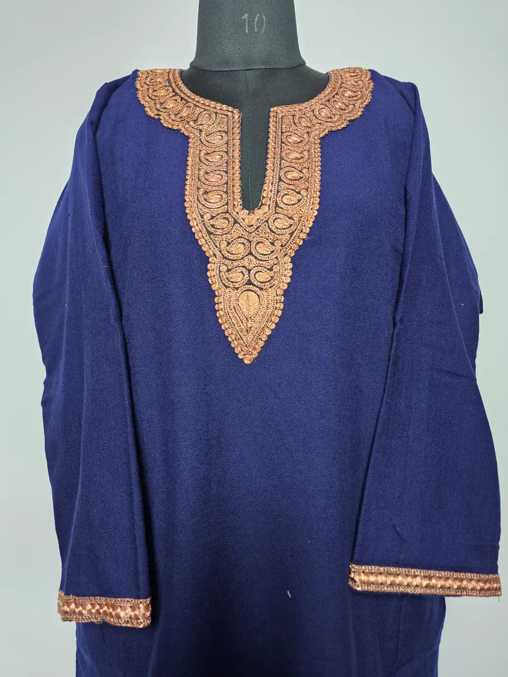 Crafted in dark blue this Kashmiri phiran is enhanced with zari tilla embroidery at the neckline where badam motifs details have been stitched to create subtle depth. It comes in chest size 52 inches and length 43 to ensure a flowing piece.